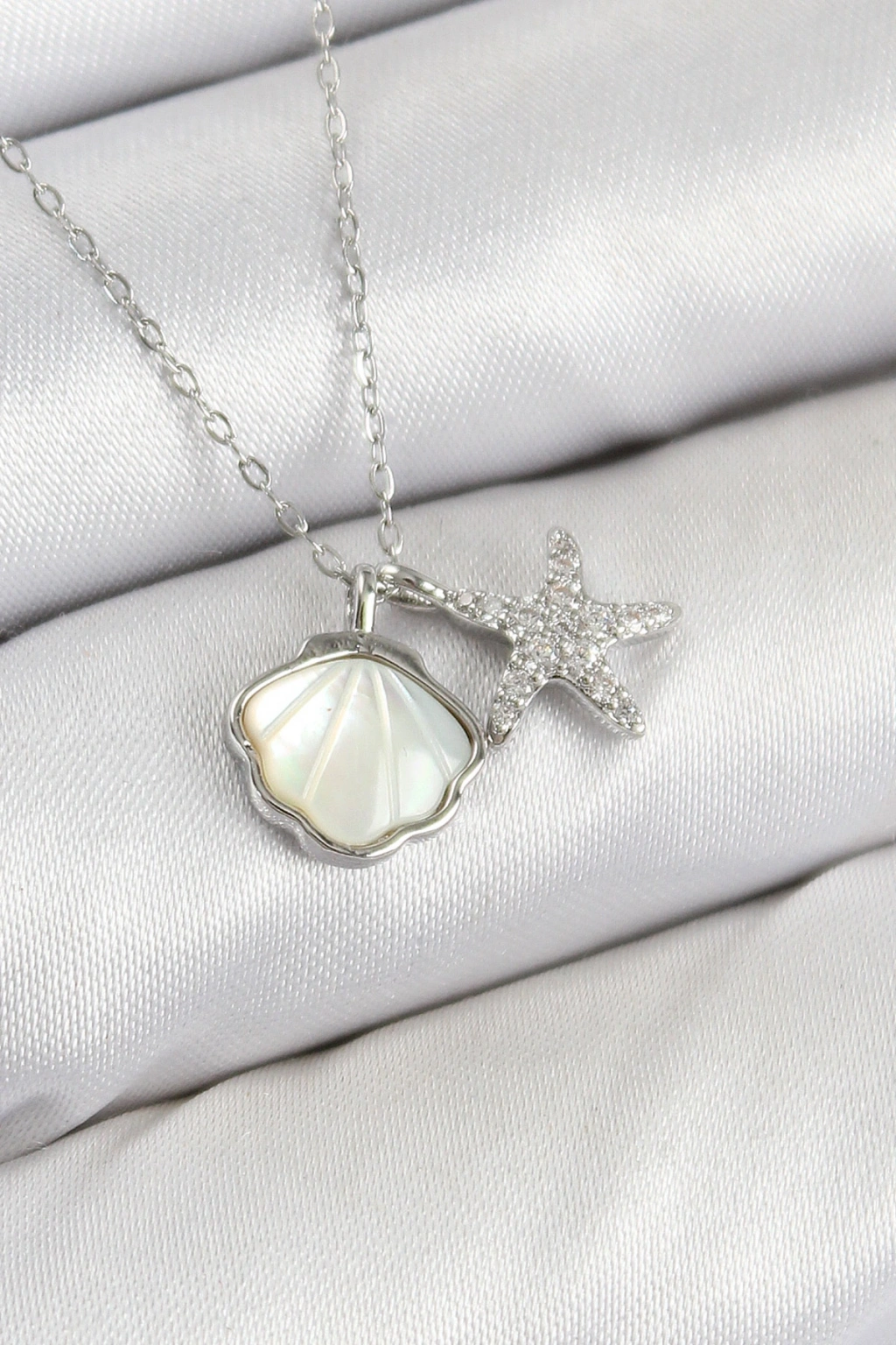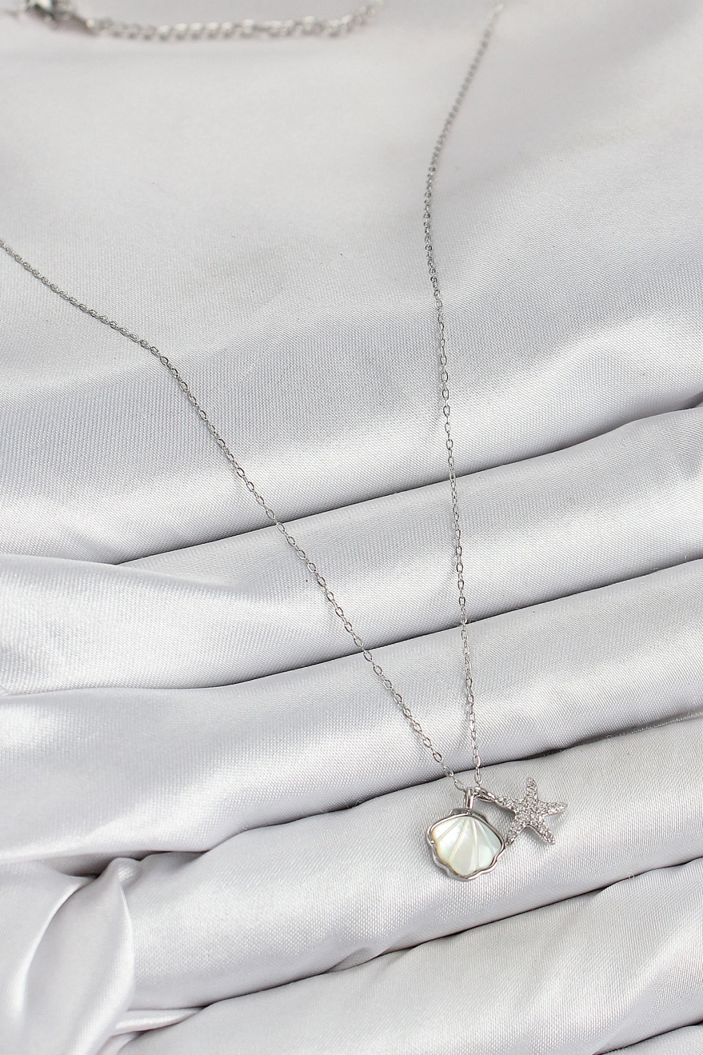Pirinç Zirkon Taşlı İstiridye Ve Deniz Yıldızı Model Gümüş Renk Kadın Kolye