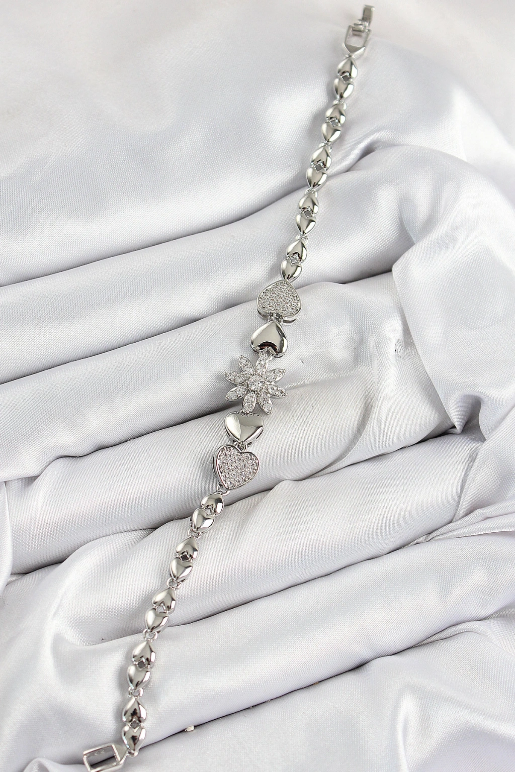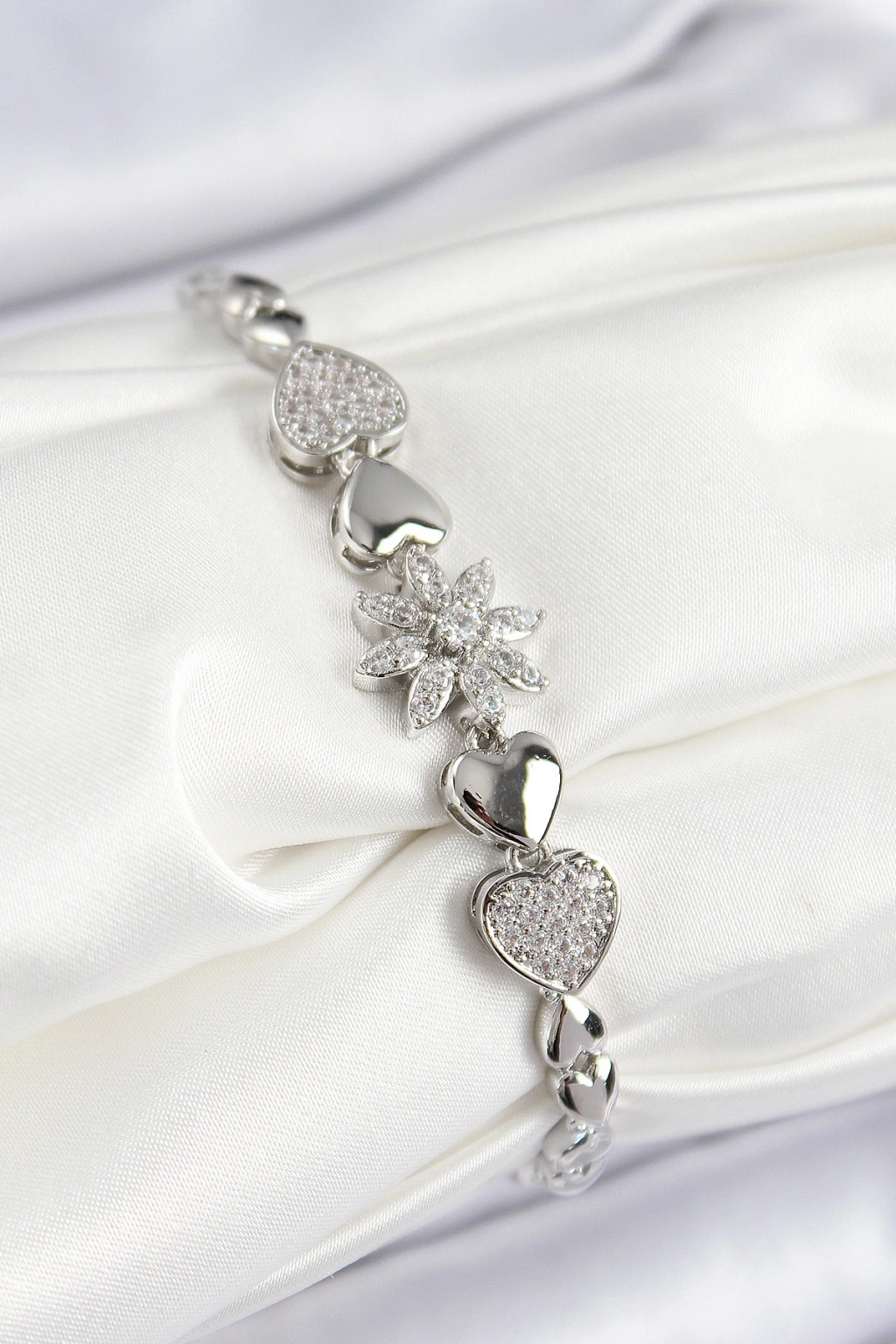 Pirinç Zirkon Taşlı Kalp Detaylı Çiçek Model Gümüş Renk Kadın Bileklik