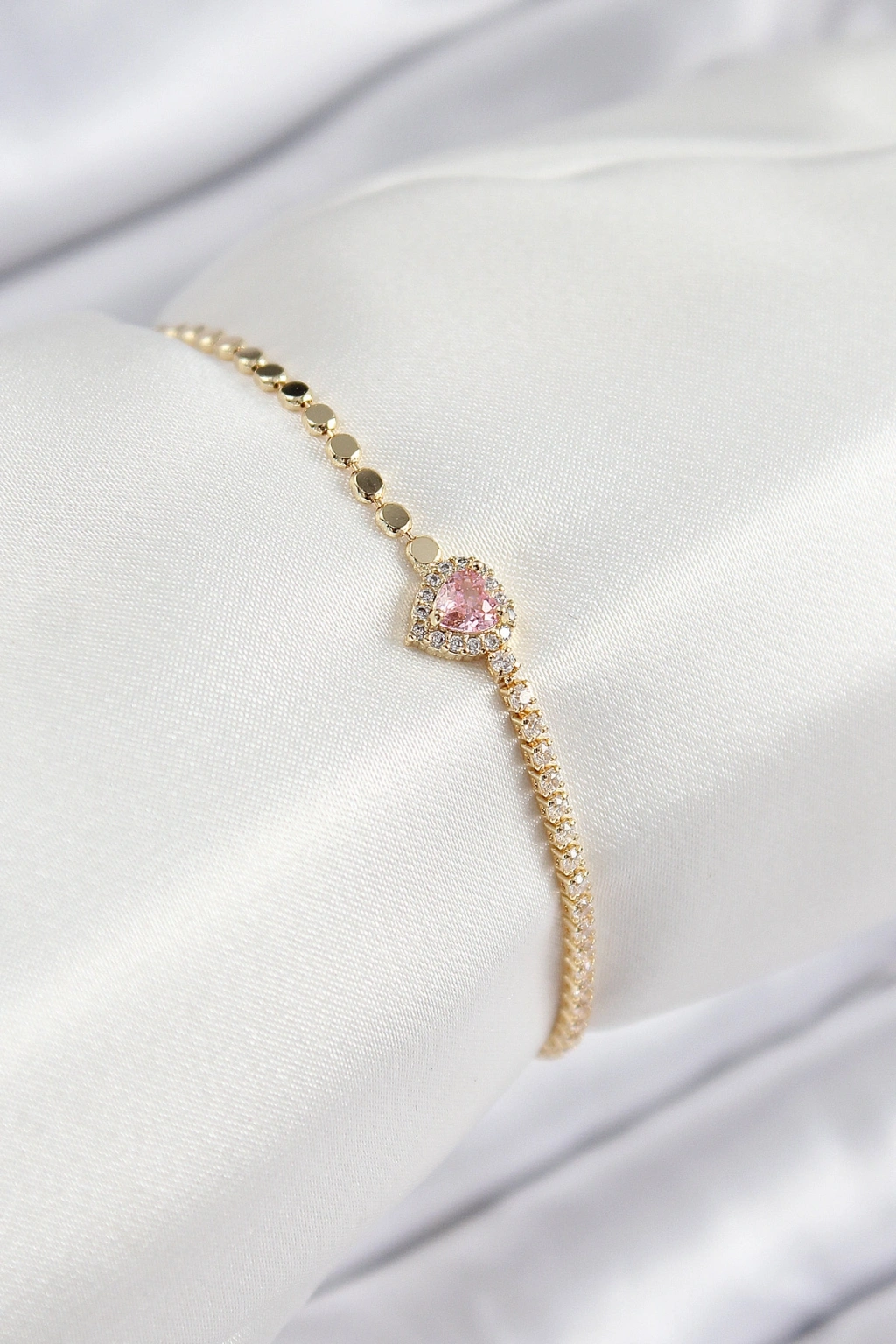 Pirinç Zirkon Taşlı Kalp Model Ezme Zincir Gold Renk Kadın Bileklik