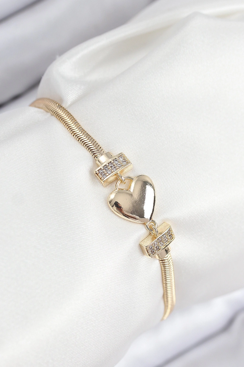 Pirinç Zirkon Taşlı Kalp Model Gold Renk Kadın Bileklik