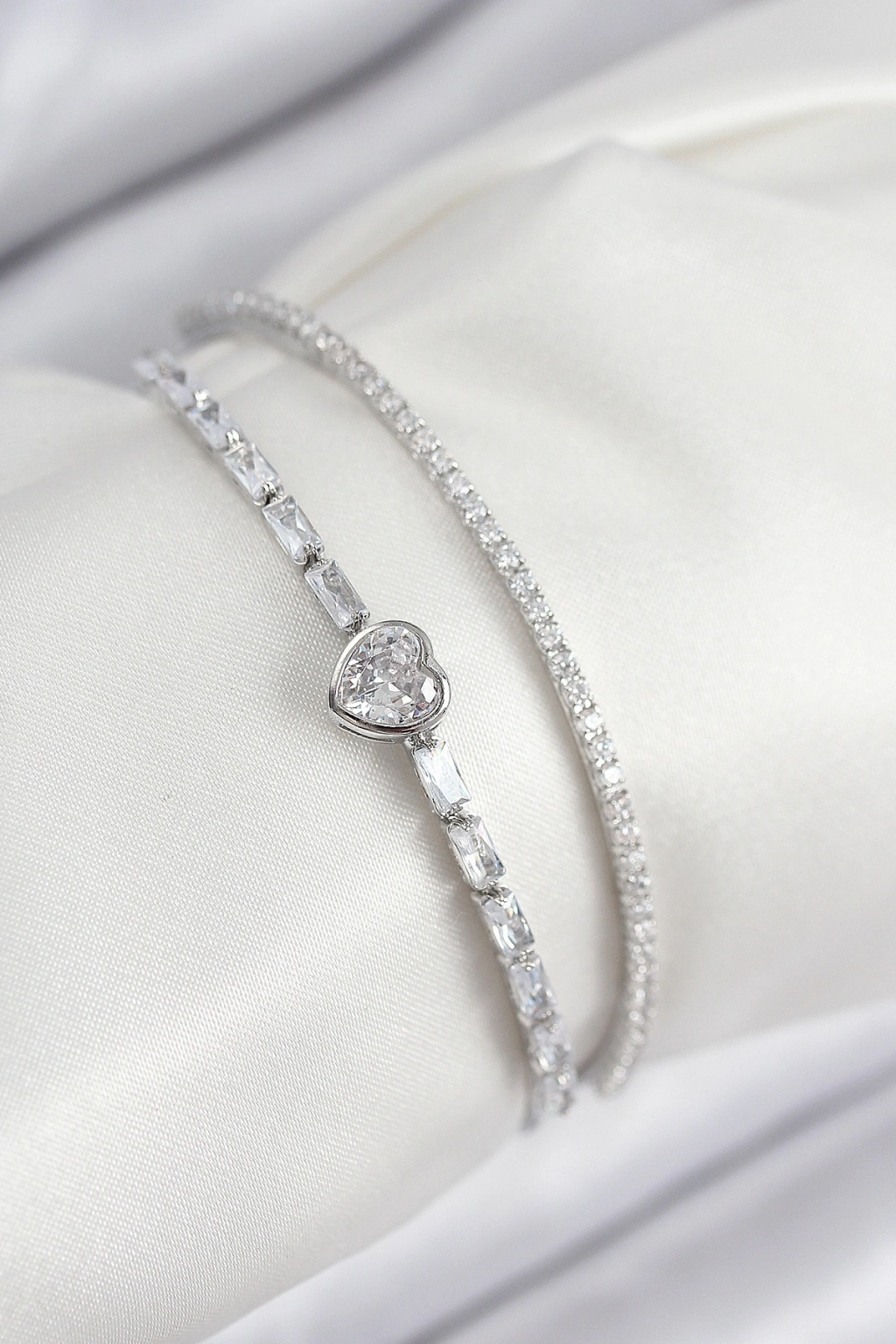 Pirinç Zirkon Taşlı Kalp Model Gümüş Renk Kadın Bileklik