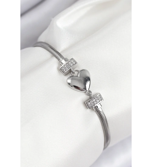 Pirinç Zirkon Taşlı Kalp Model Gümüş Renk Kadın Bileklik