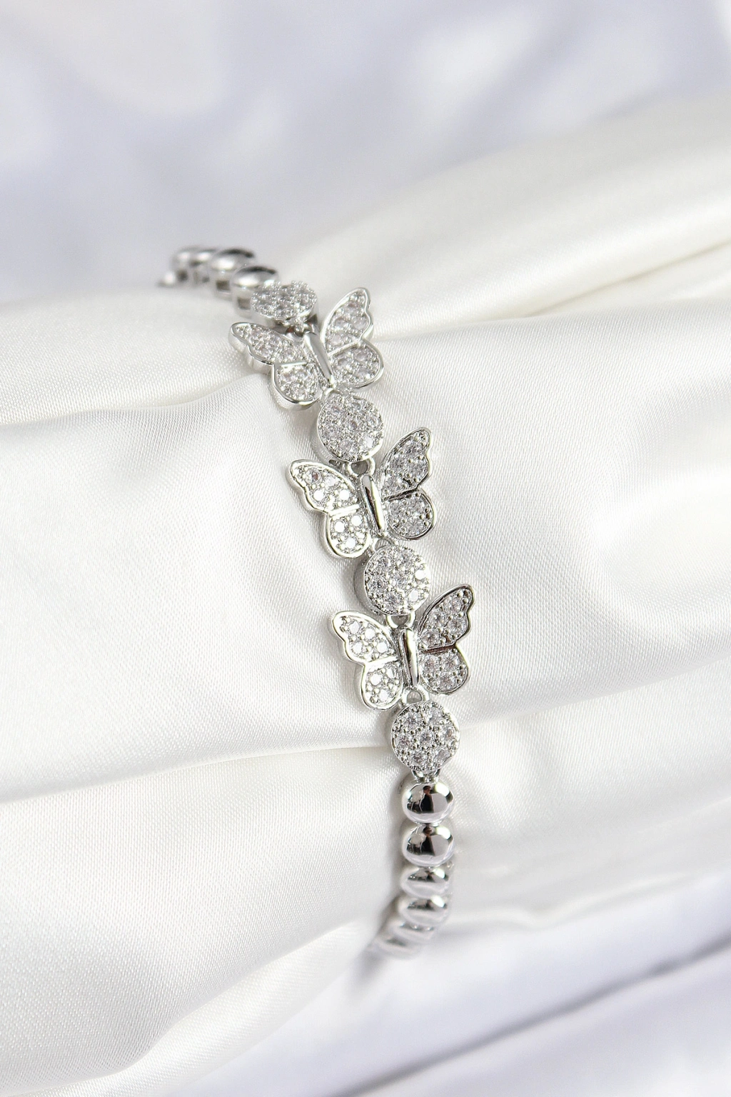 Pirinç Zirkon Taşlı Kelebek Model Gümüş Renk Kadın Bileklik