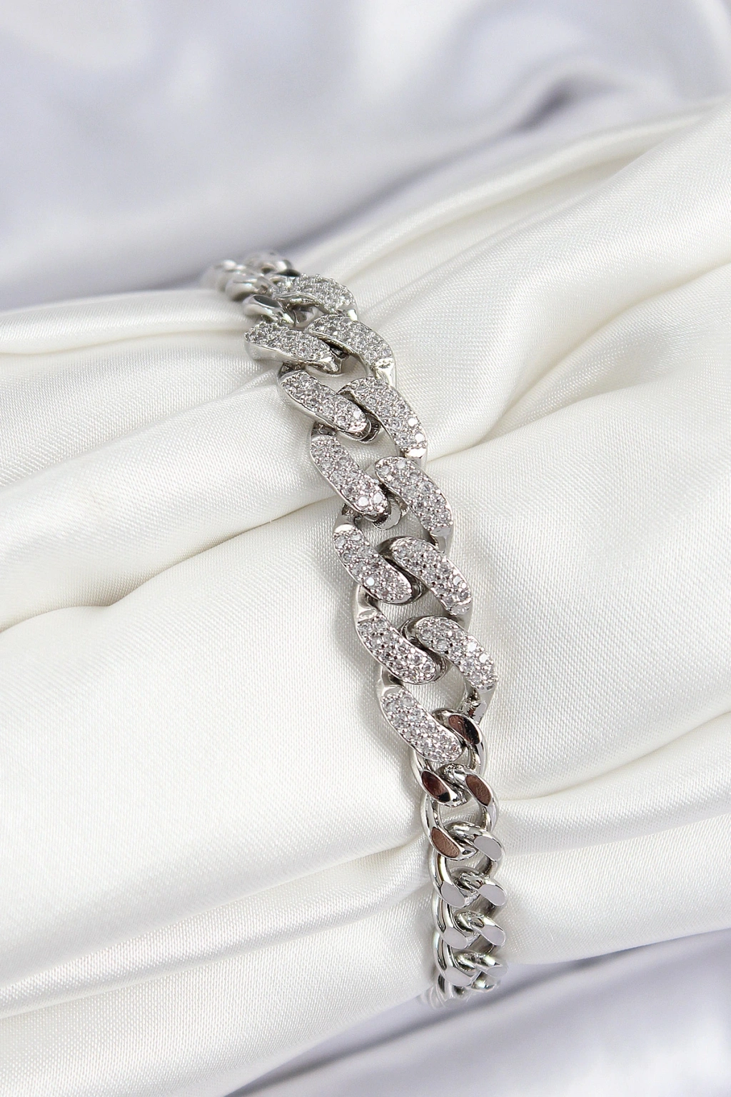Pirinç Zirkon Taşlı Küba Zincir Model Gümüş Renk Kadın Bileklik