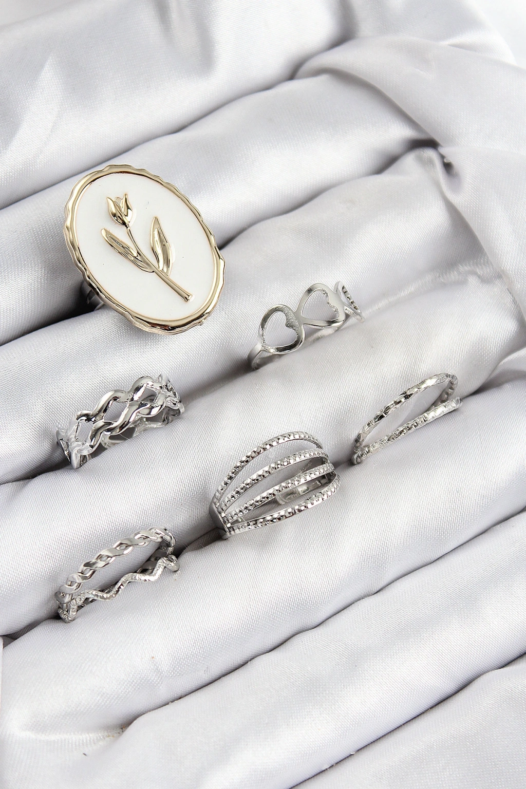 Pirinç Zirkon Taşlı Lale Model Gümüş Renk Kadın Yüzük Kombin Set