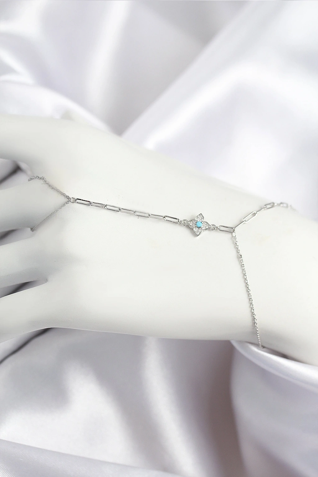 Pirinç Zirkon Taşlı Mavi Boncuklu Yonca Model Gümüş Renk Şahmeran
