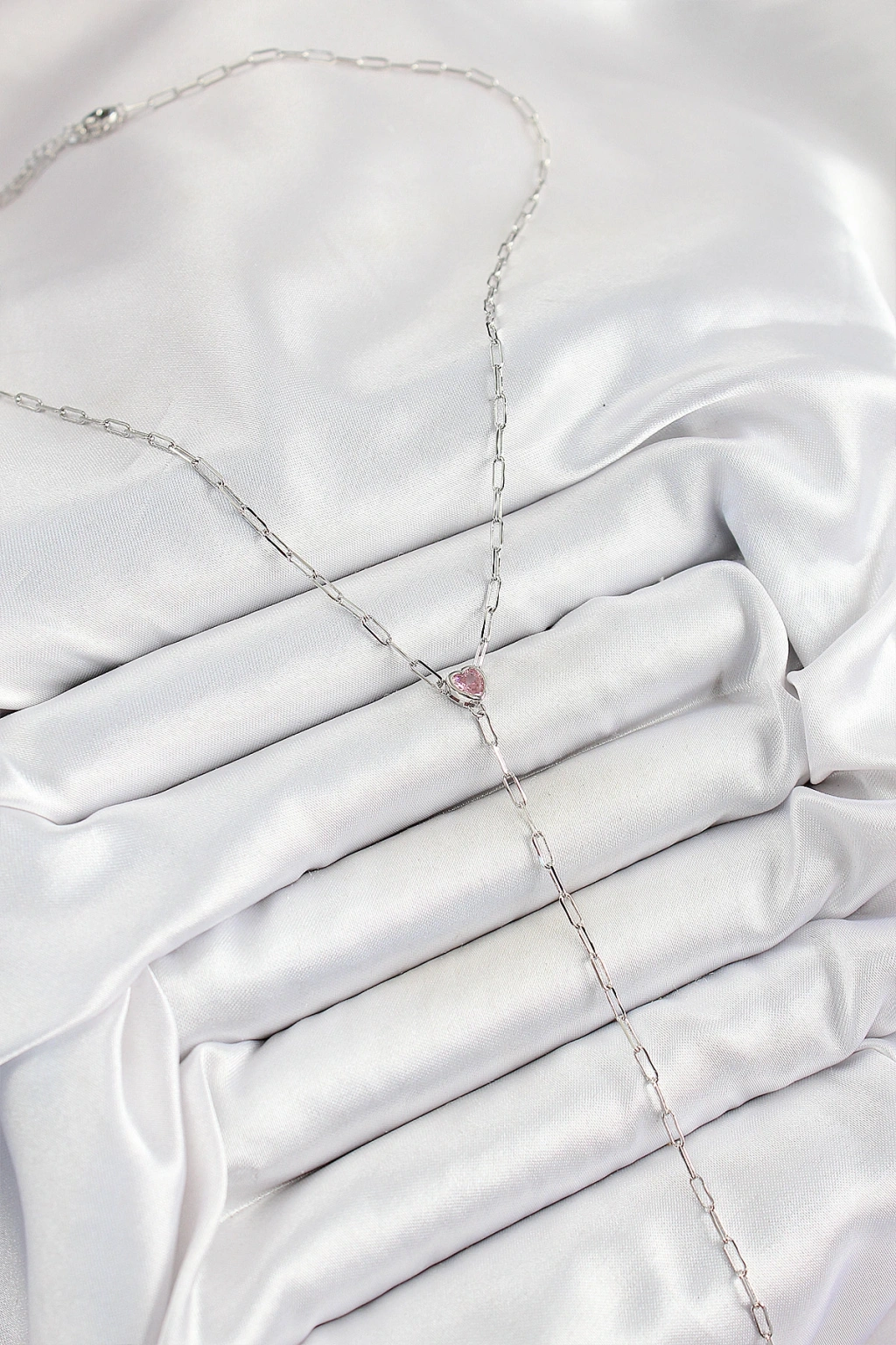 Pirinç Zirkon Taşlı Pembe Kalp Figürlü Y Model Gümüş Renk Kadın Kolye