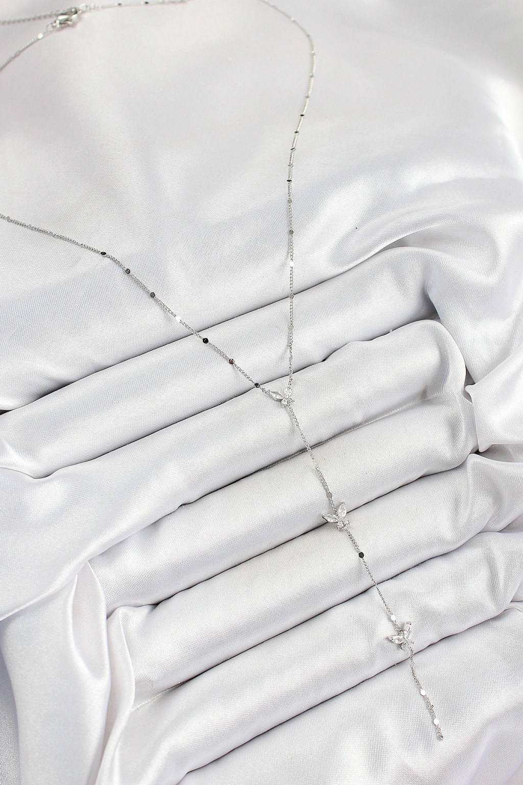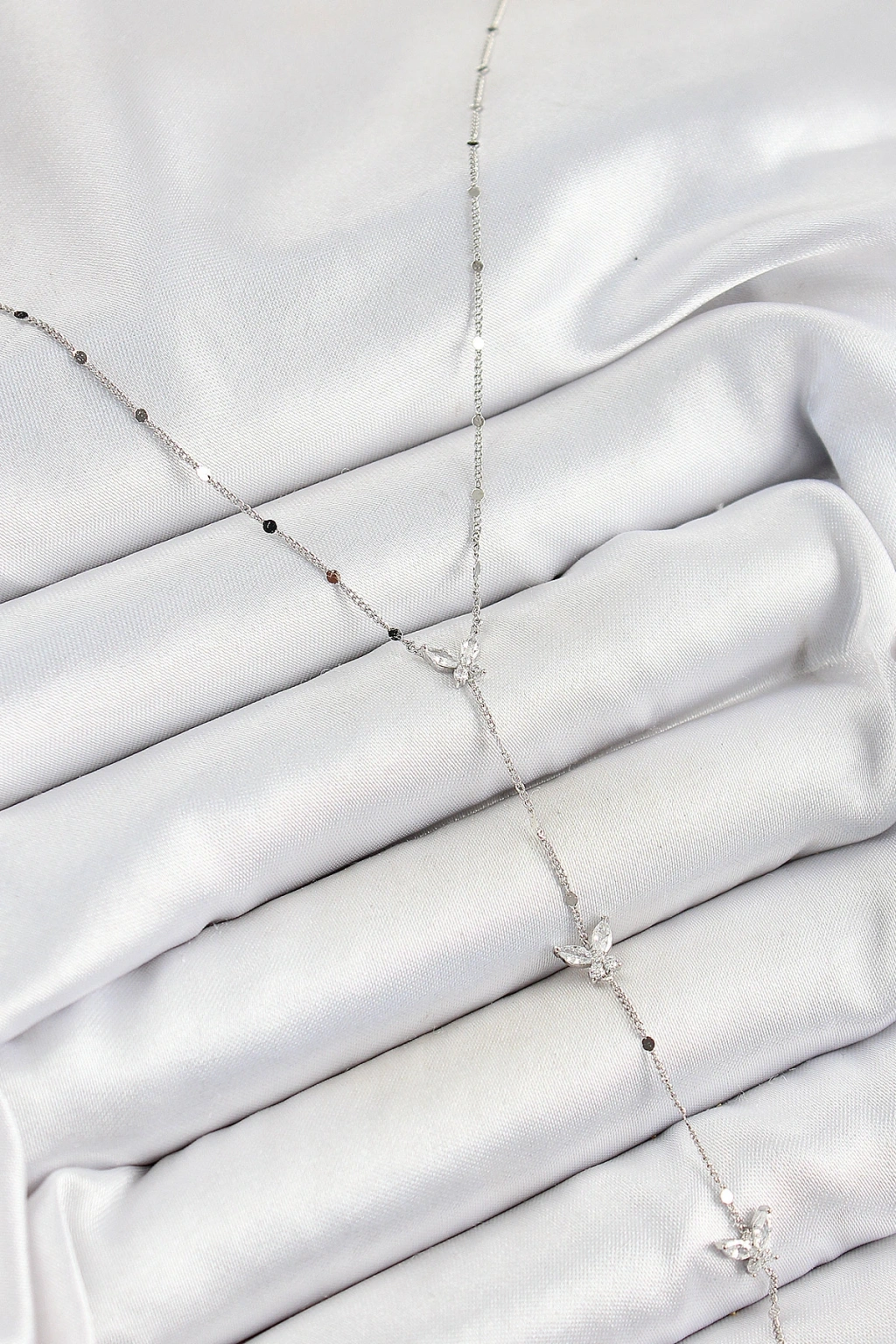 Pirinç Zirkon Taşlı Sıralı Kelebek Figürlü Y Model Gümüş Renk Kadın Kolye