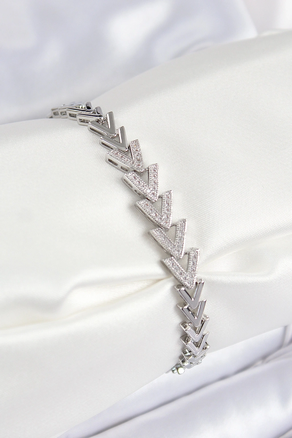 Pirinç Zirkon Taşlı Sıralı Ok Model Gümüş Renk Kadın Bileklik