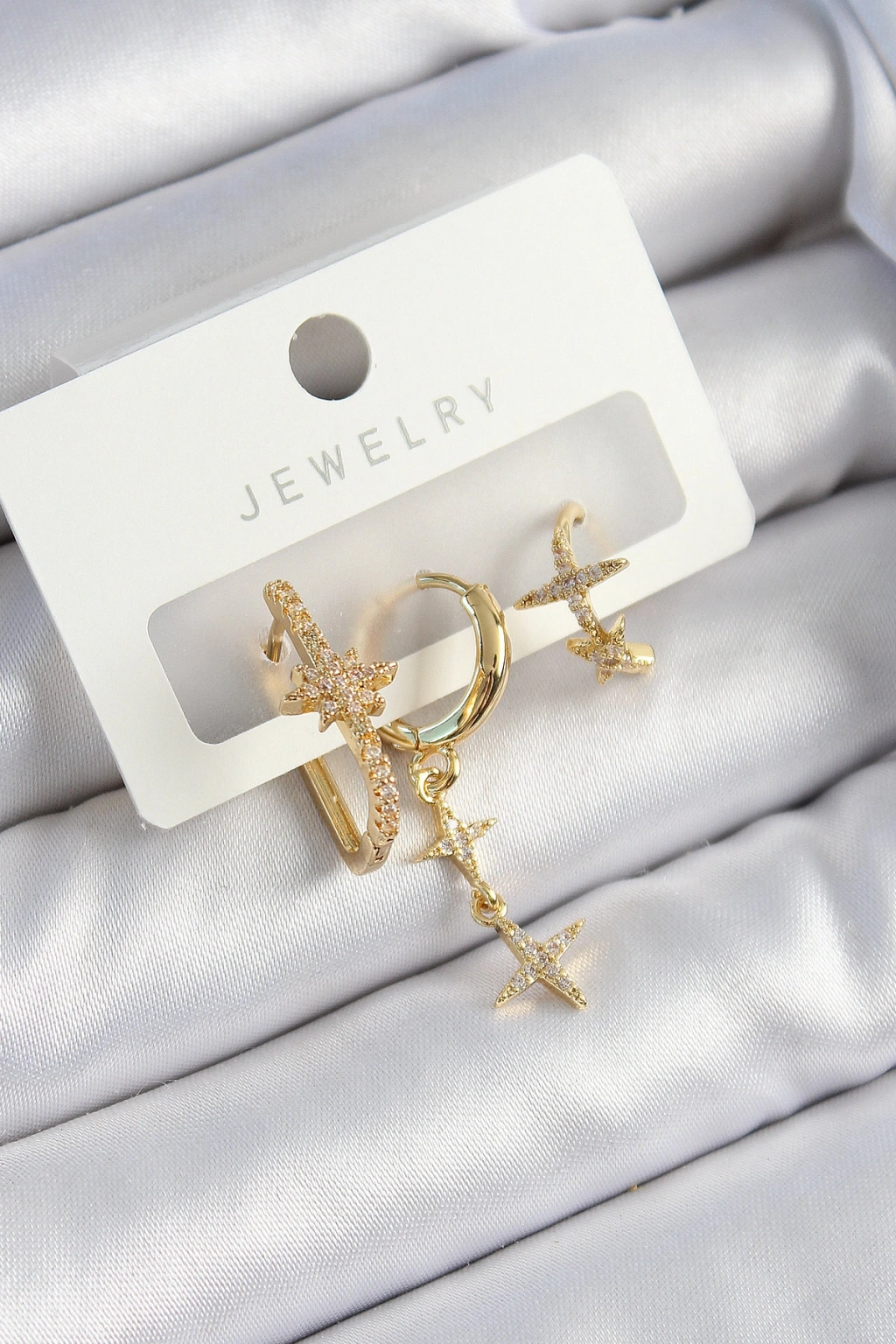Pirinç Zirkon Taşlı Yıldız Model Gold Renk 3'lü Çift Kadın Küpe Set