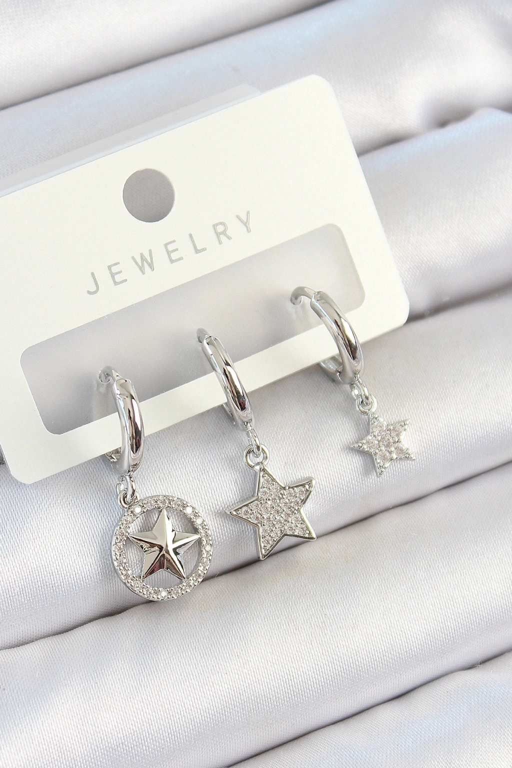 Pirinç Zirkon Taşlı Yıldız Model Gümüş Renk 3'lü Çift Kadın Küpe Set