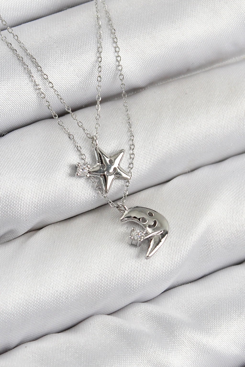 Pirinç Zirkon Taşlı Yıldız Ve Ay Model Gümüş Renk Kadın Kolye