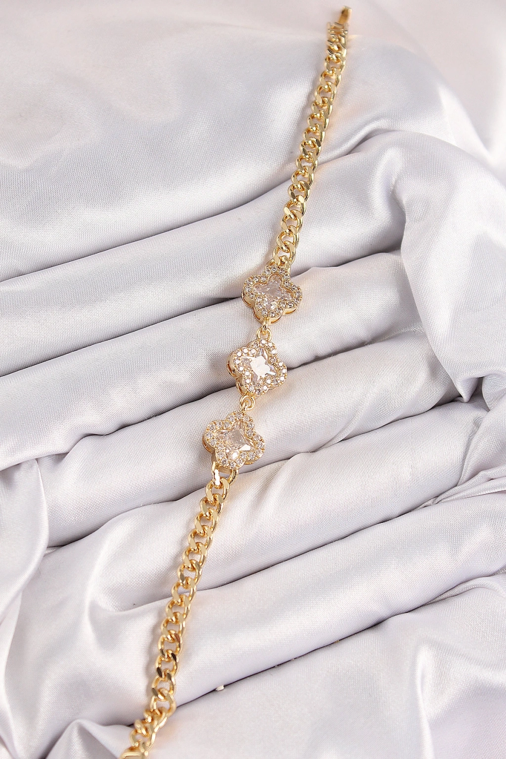 Pirinç Zirkon Taşlı Yonca Model Gold Renk Kadın Bileklik