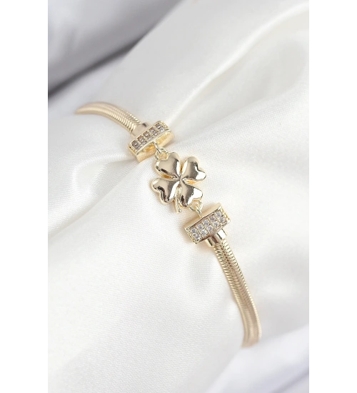 Pirinç Zirkon Taşlı Yonca Model Gold Renk Kadın Bileklik