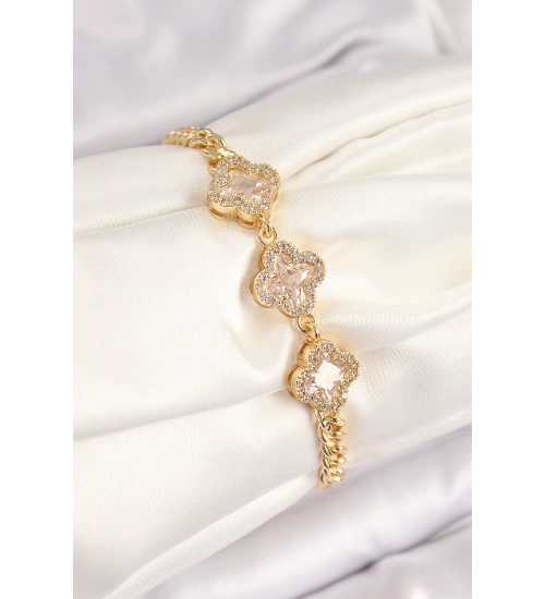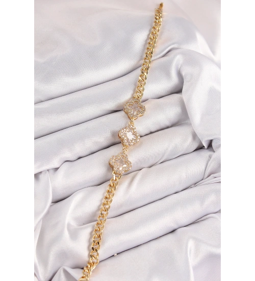 Pirinç Zirkon Taşlı Yonca Model Gold Renk Kadın Bileklik