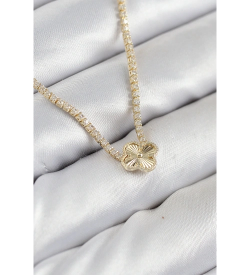 Pirinç Zirkon Taşlı Yonca Model Gold Renk Kadın Kolye
