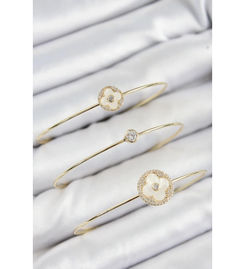 Pirinç Zirkon Taşlı Yonca Model Gold Renk Vip 3'lü Kadın Bileklik