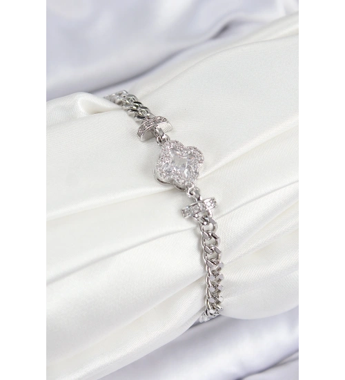 Pirinç Zirkon Taşlı Yonca Model Gümüş Renk Kadın Bileklik