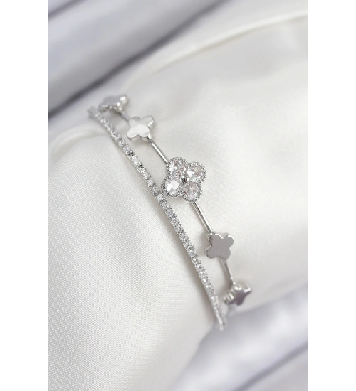 Pirinç Zirkon Taşlı Yonca Model Gümüş Renk Kadın Bileklik