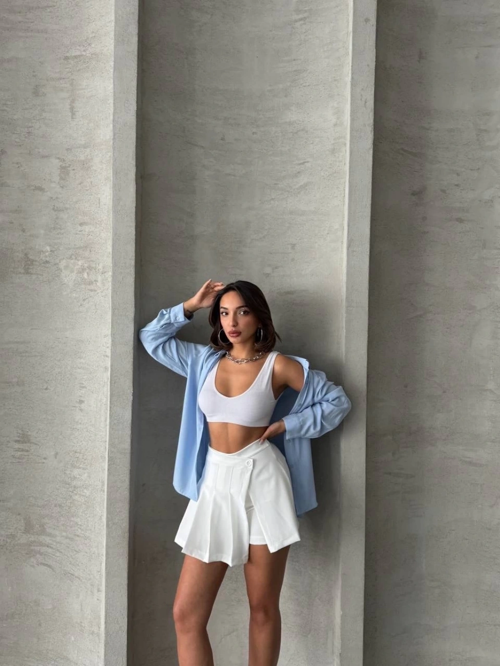 İki düğmeli kaz ayağı desen ch kumaş şort etek beyazturuncu h26414