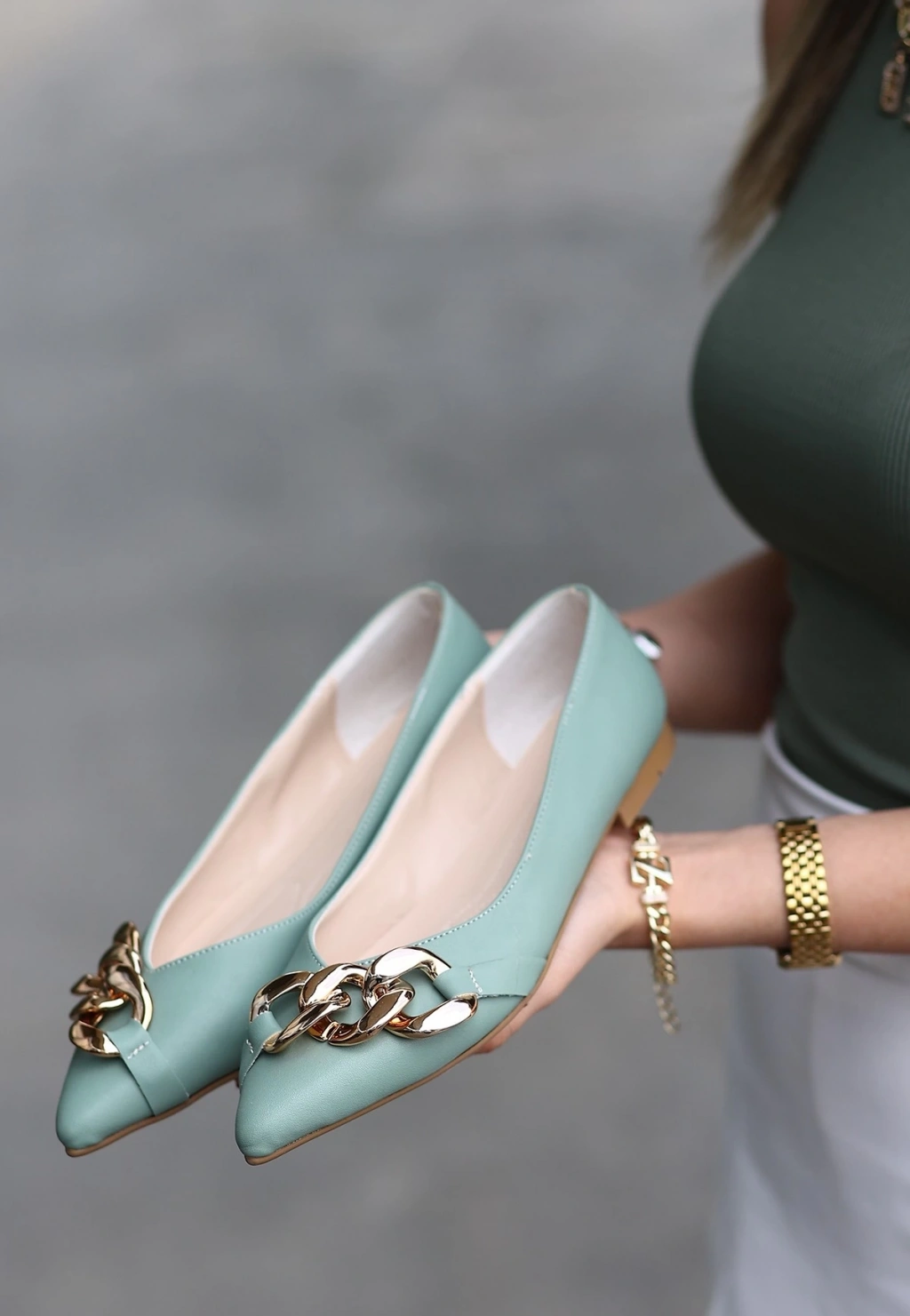 • Popi Mint Yeşili Cilt Zincirli Babet Ayakkabı