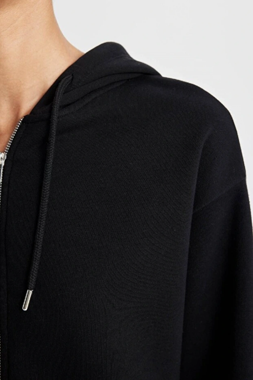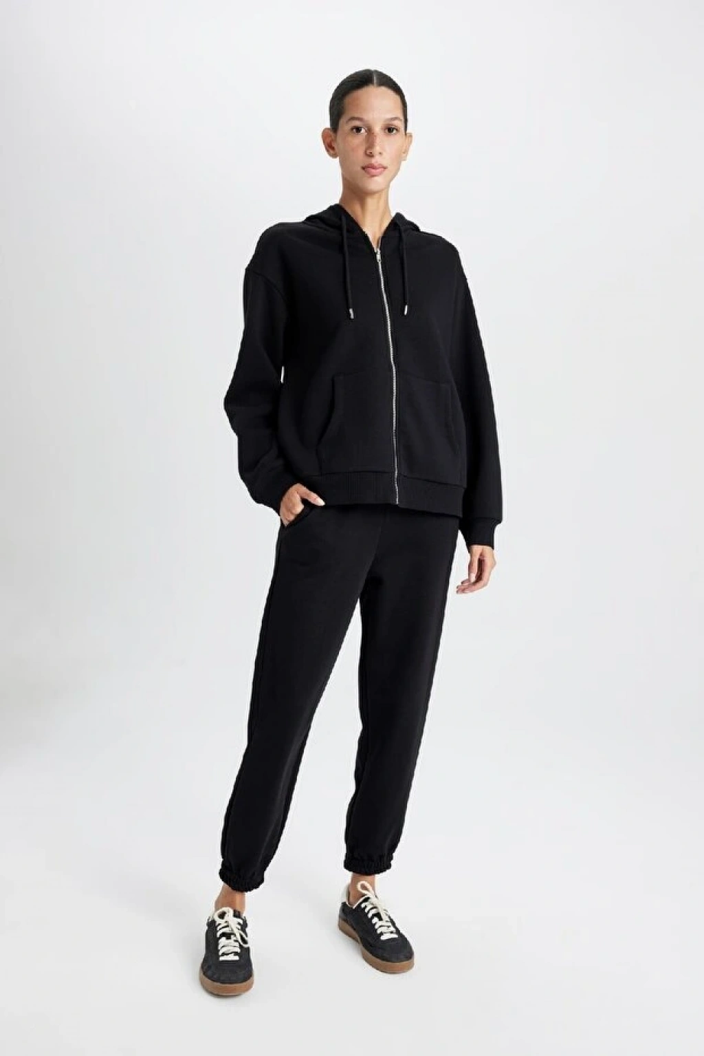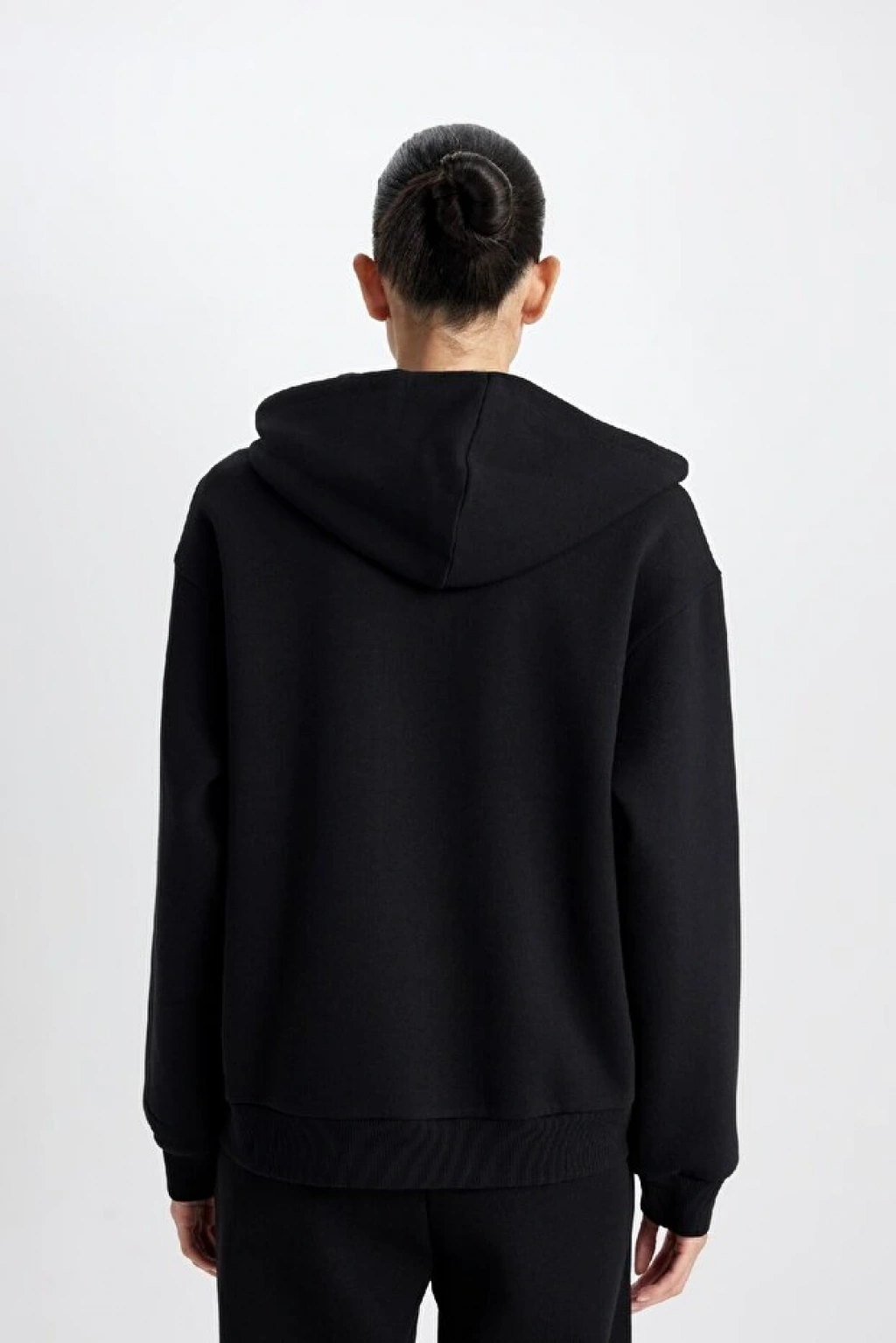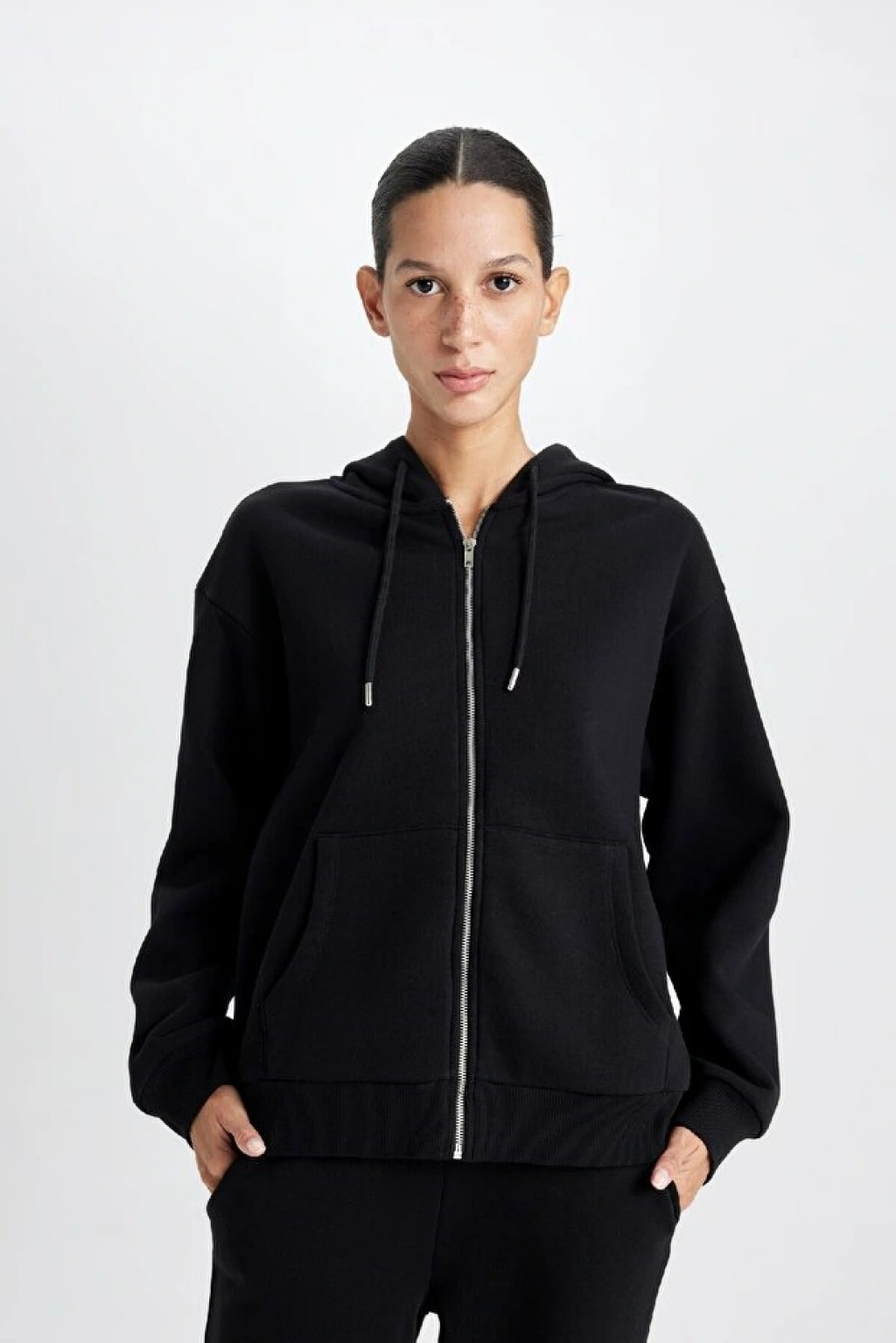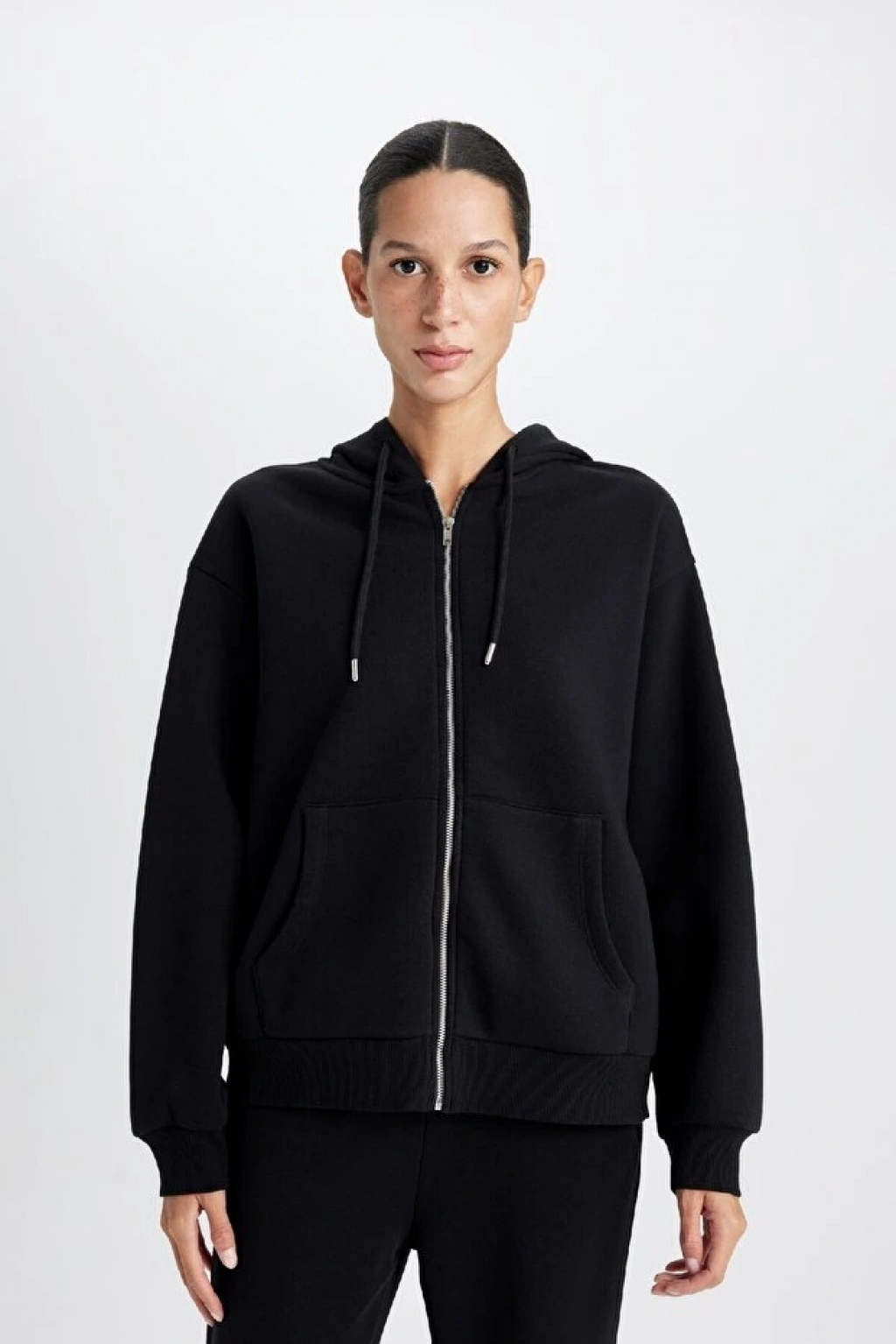 Relax Fit Kapüşonlu Cepli Basic Düz Fermuarlı Sweatshirt