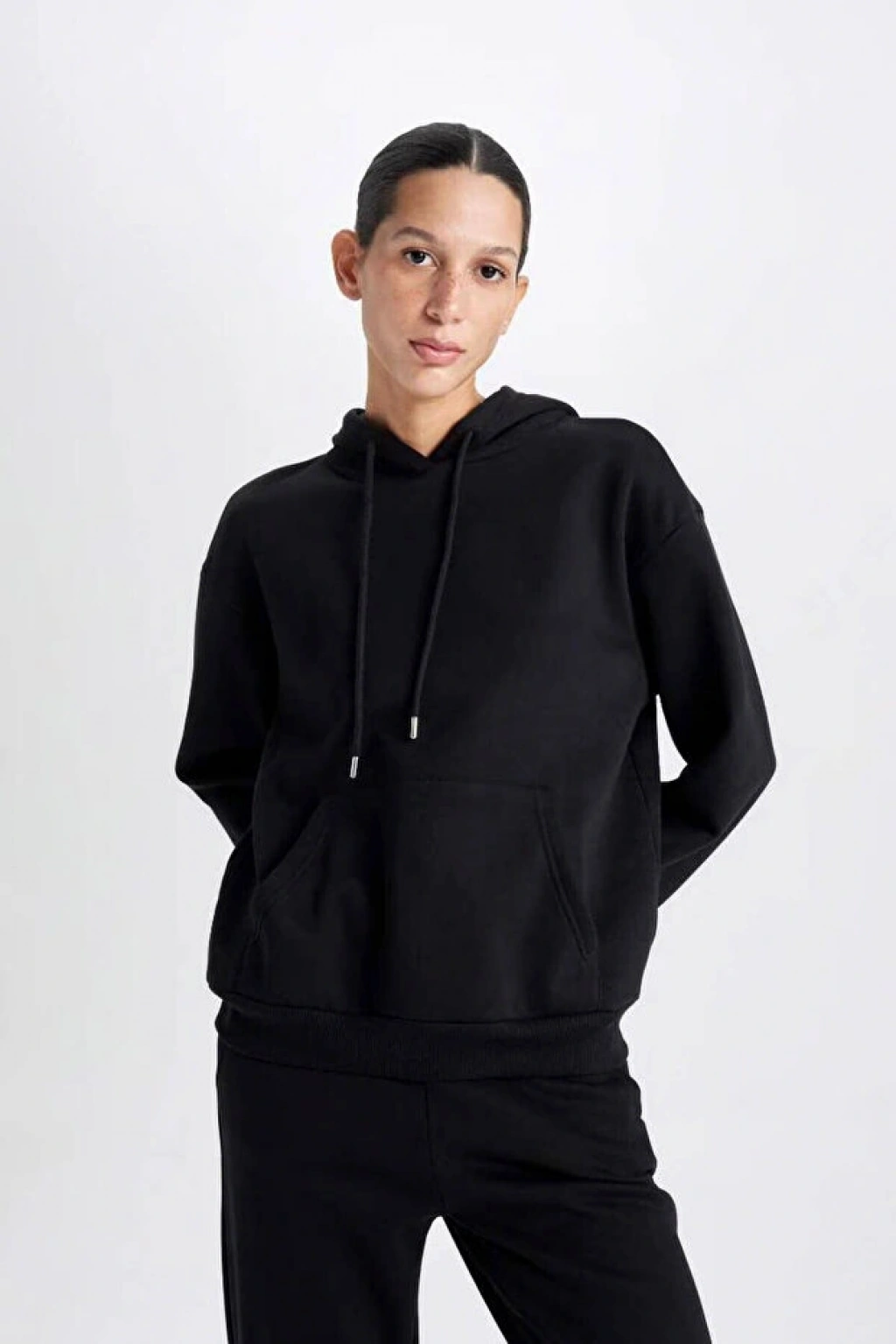 Relax Fit Kapüşonlu Kanguru Cepli Kalın Basic Düz Siyah Sweatshirt