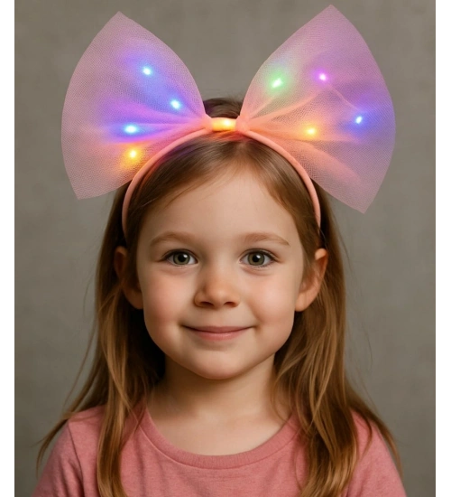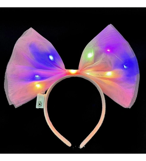 Rengarenk Led Işıklı Fiyonk Şekilli Tül Parti Tacı Pembe Renk 25x25 cm