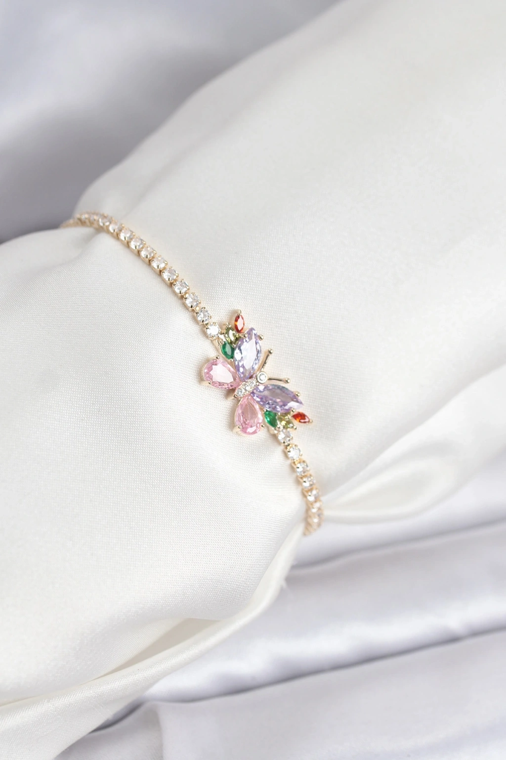 Renkli Kelebek Model Zirkon Taşlı Asansörlü Su Yolu Kadın Bileklik