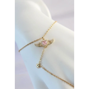 316L Çelik Gold Renk Pembe Zirkon Taşlı Kanatlı Kalp Model Şahmeran