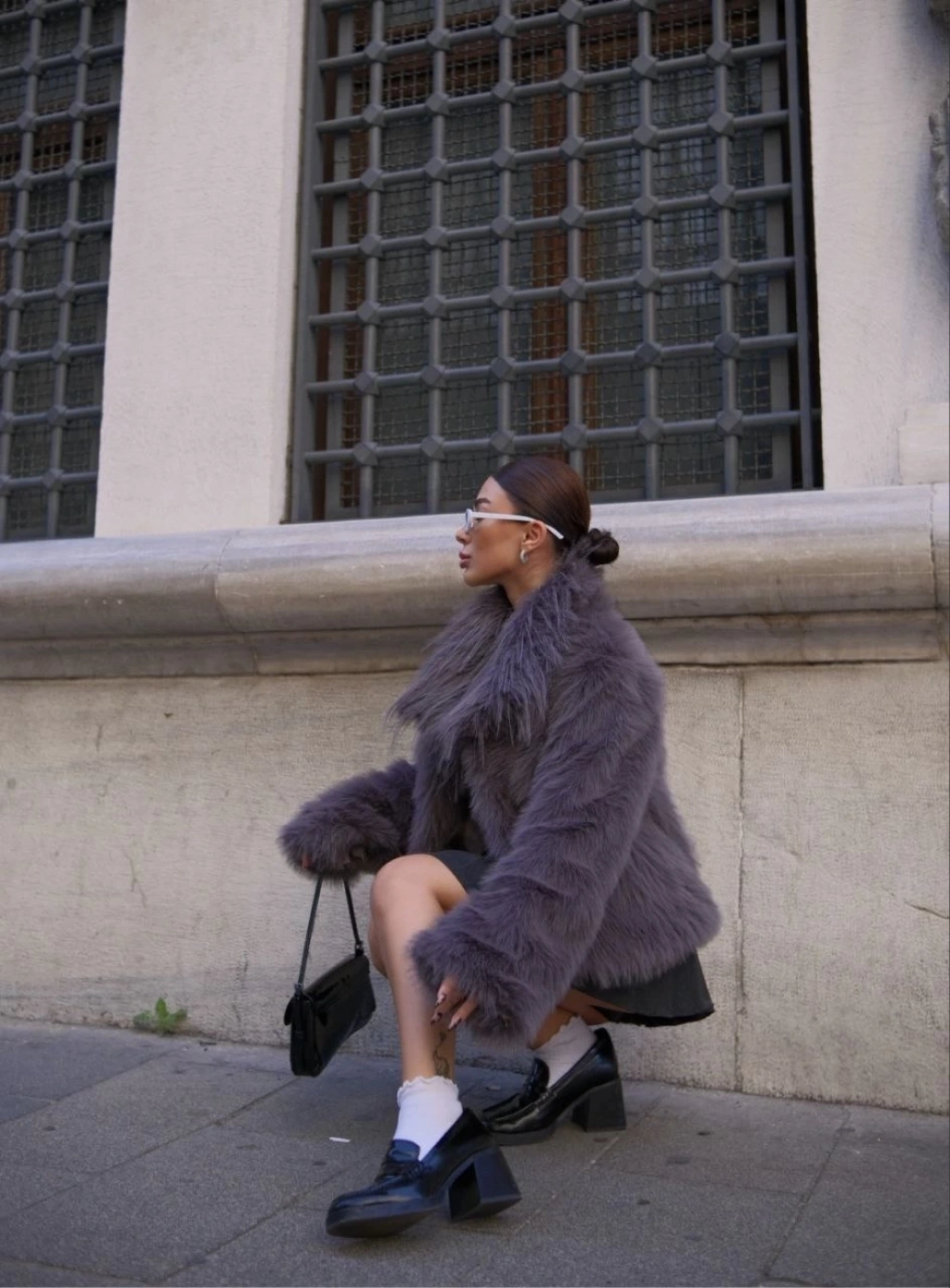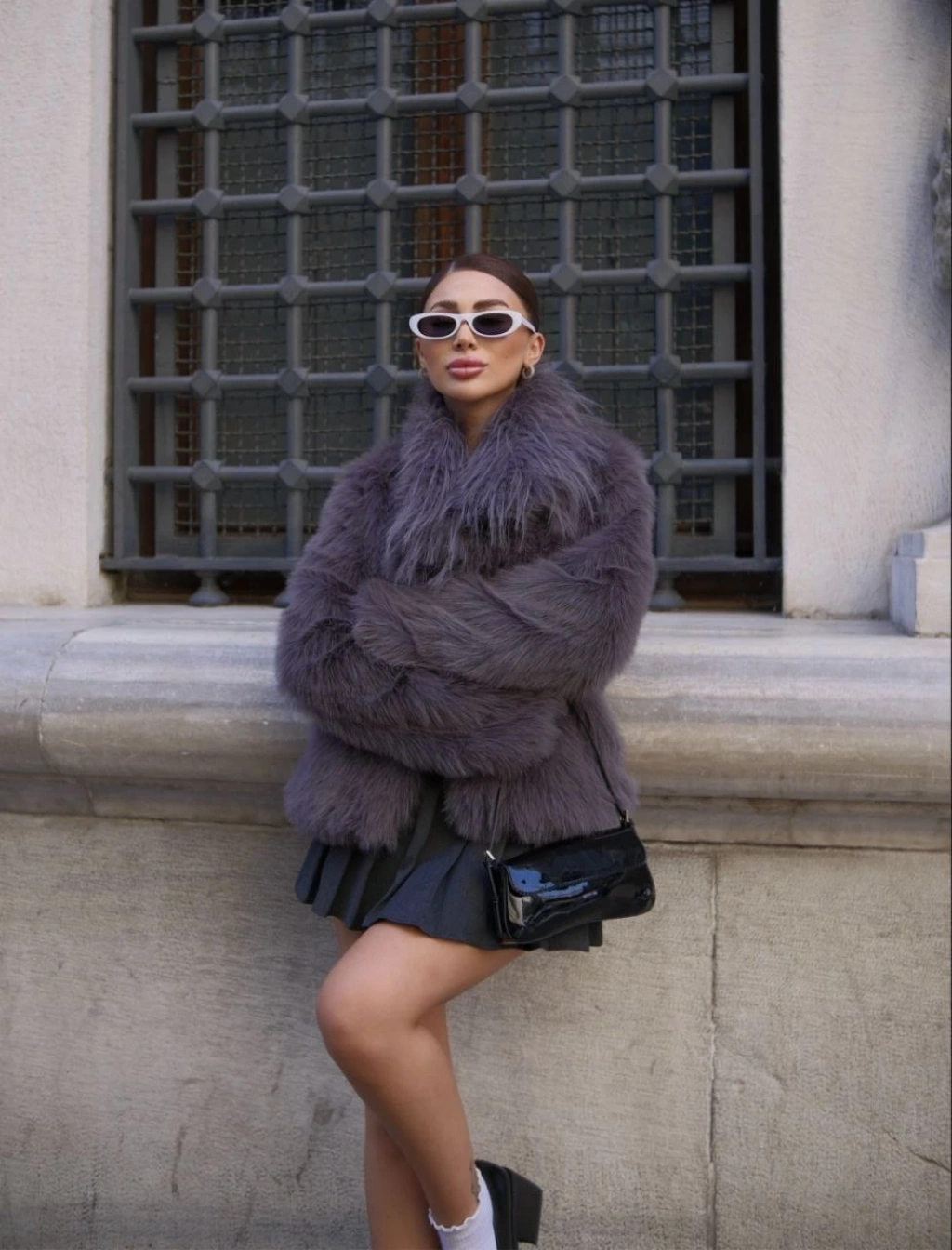 Salaş Sakallı Yumuşak Dokulu Yakalı Cepli Suni Kürk - Füme