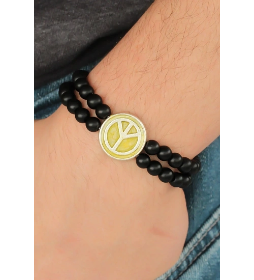 Günlük kombinlerinizi Sarı Metal Barış Simgesi Tasarımlı Siyah Renk Mat Oniks Doğal Taş Erkek Bileklik ile detaylandırın.