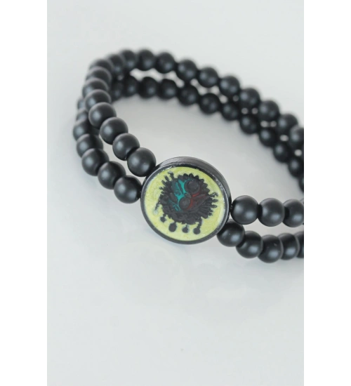 Dikkat çeken kombinleriniz için Sarı Renkli Metal Üzerine Osmanlı Arma Figürlü Siyah Renk Çift Sıra Doğal Taş Erkek Bileklik özel olarak tasarlandı.