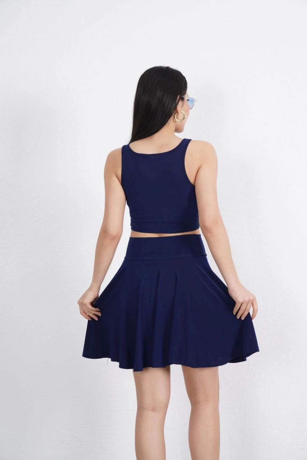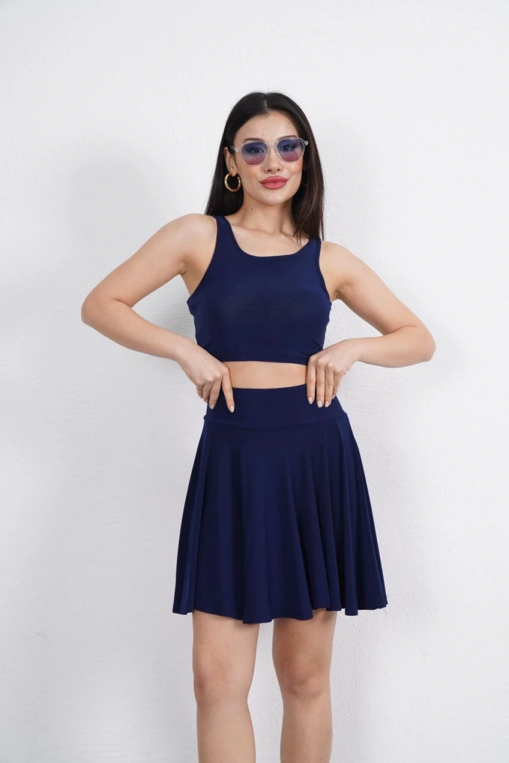 OSY MODAL YUMUŞAK DOKULU KUMAŞ KADIN PARÇALI BİSİKLET YAKA T-SHİRT MİNİ ŞORTLU ETEK İKİLİ TAKIM -LACİVERT