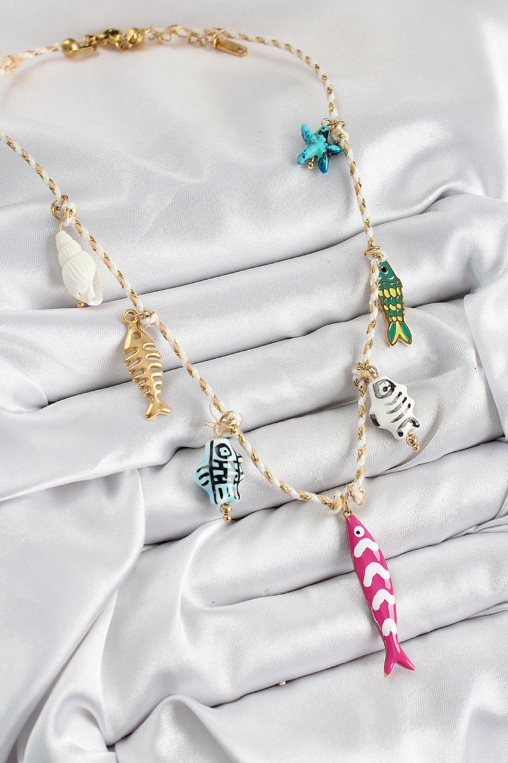 Seramik Motifli Pembe Balık Figürlü Model Krem İp Kadın Kolye