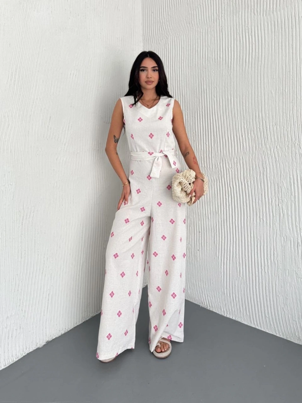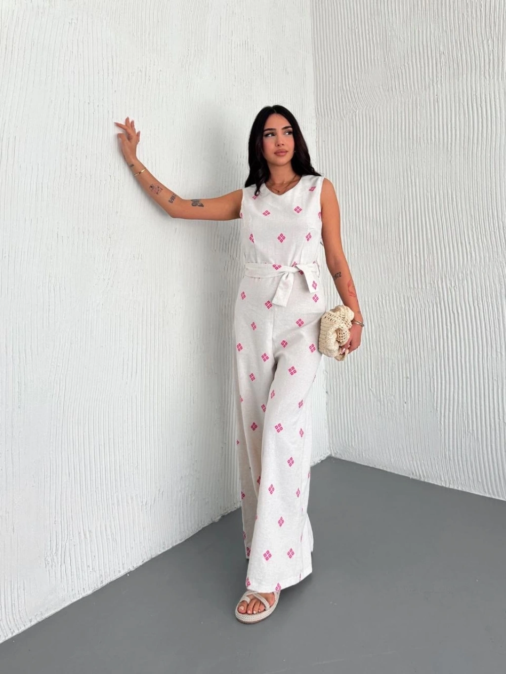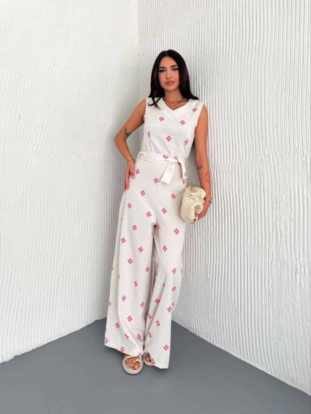 Kuşaklı gömlek yaka salaş tulum bej s255822