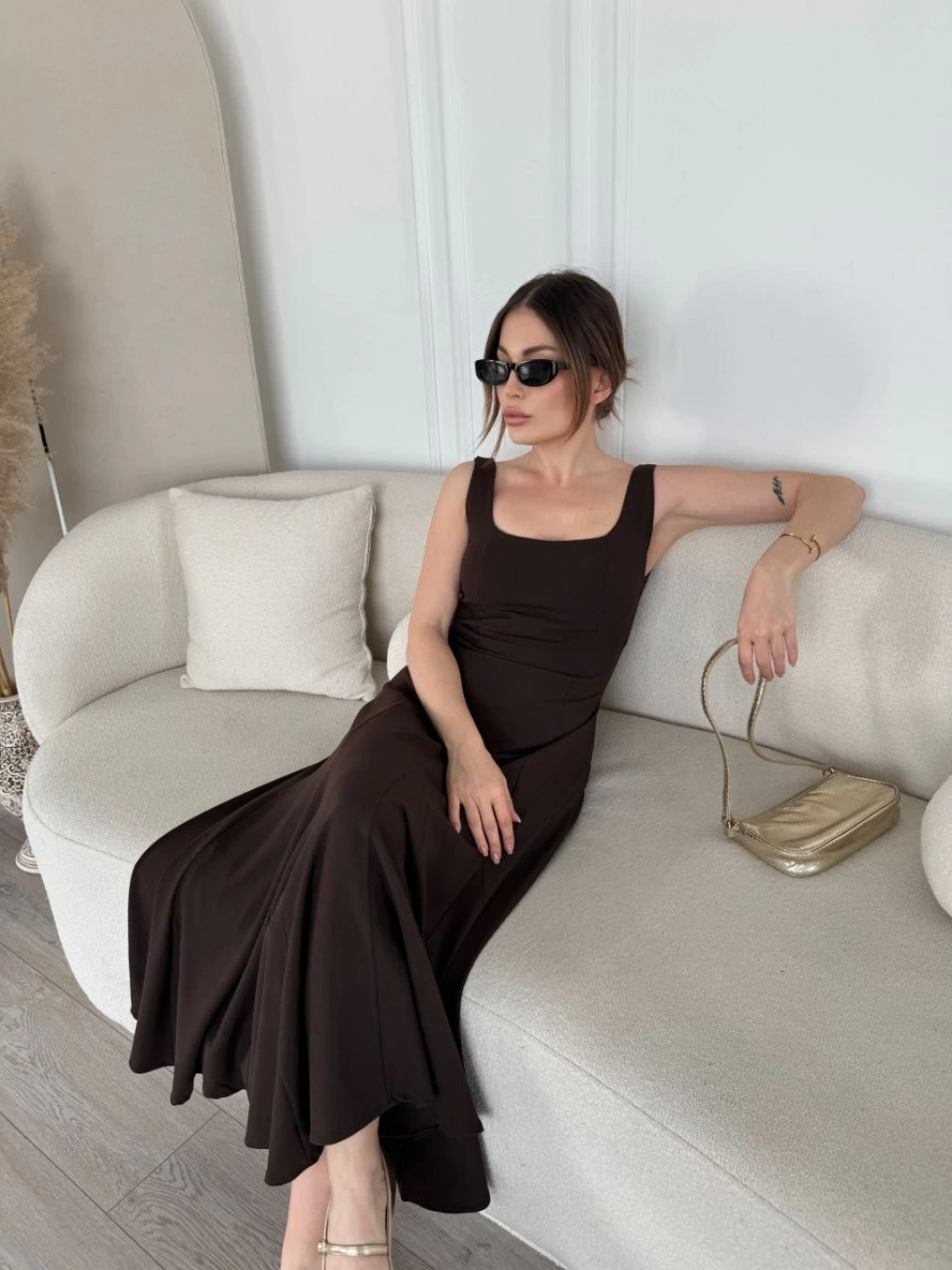 KADIN BOĞAZLI TRİKO ELBİSE – UZUN FİTİLLİ ESNEK DOKUMA, TAM KALIP, KIŞLIK & BAHARLIK ŞIK RAHAT STİL, 130 CM MİDİ BOY ELBİSE - KAHVERENGİ