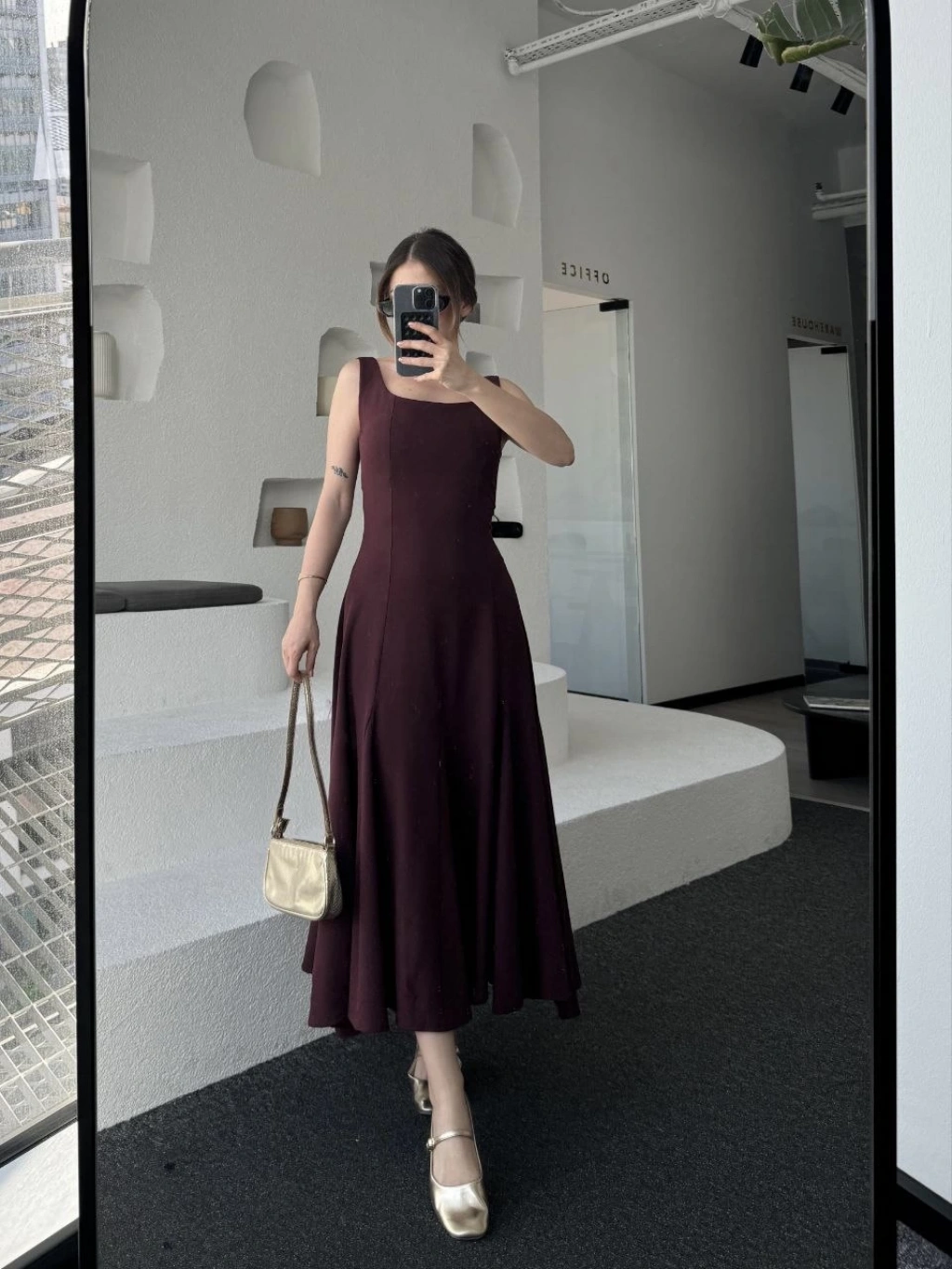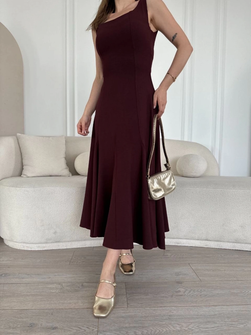 Asimetrik düşük yaka Kolsuz Uzun Elbise - Bordo