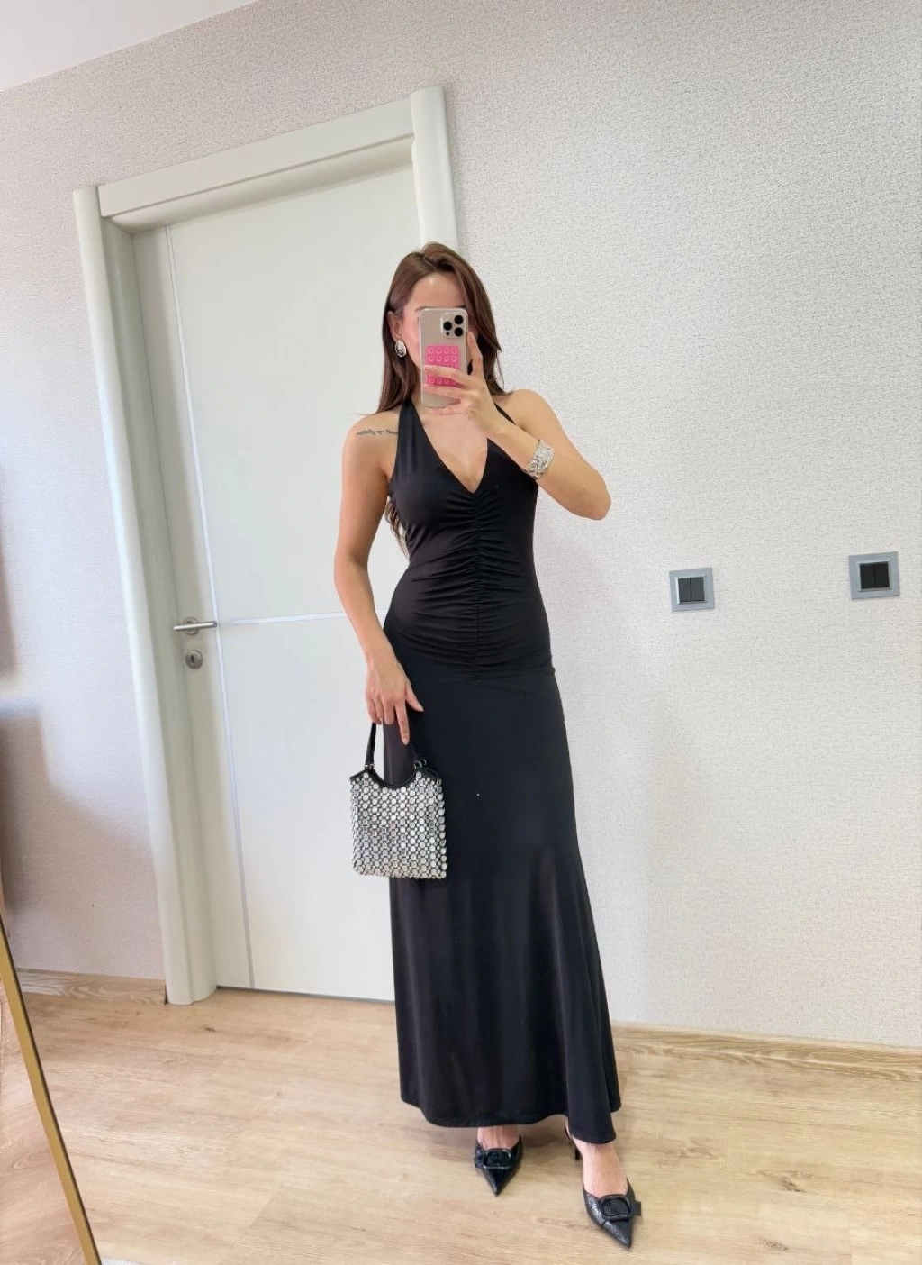 Bürümcük Kumaşlı İçi Astarlı Üzgülü Kolsuz Büzgülü Uzun Elbise - Siyah