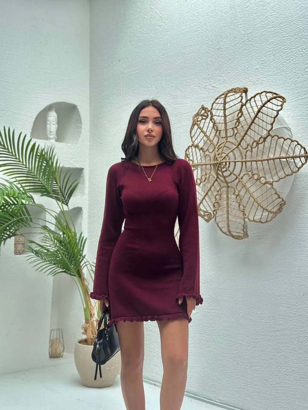 Kadın Boğazlı Uzun Fitilli Triko Dokuma Elbise - Kahverengi
