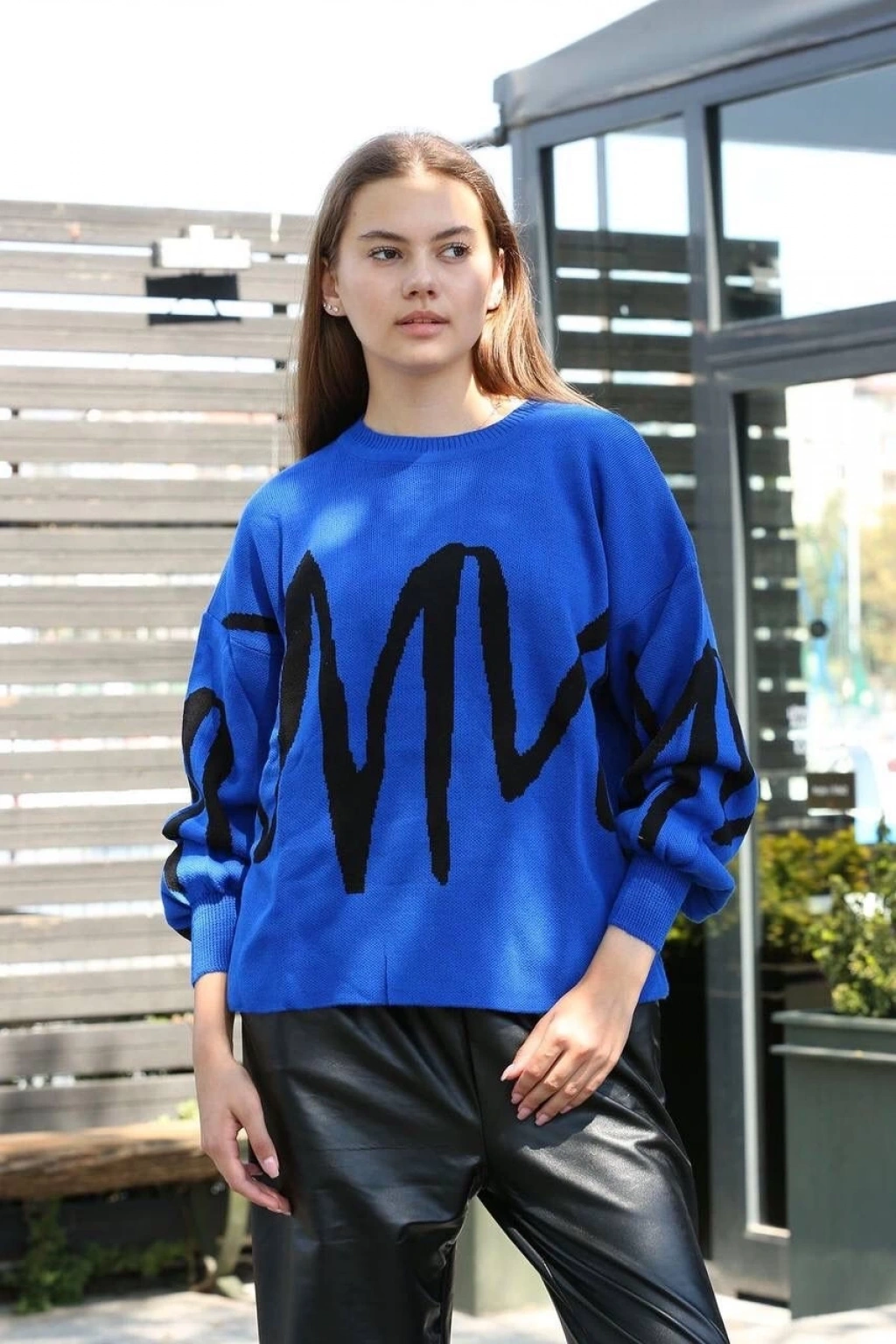 Beyaz çizgili bisiklet yaka kazak saksmavisi