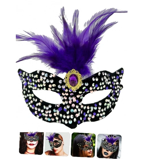 Siyah Kadife Üzeri Rengarenk Payetli Pullu Mor Tüylü Mor Taşlı Parti Maskesi 19x21 cm