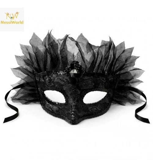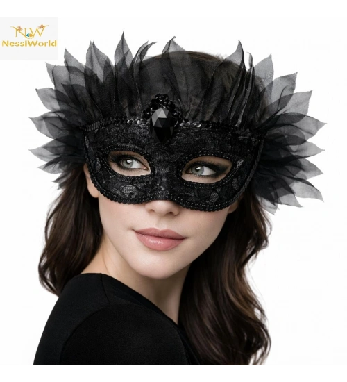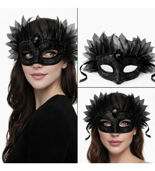 Siyah Taşlı Venedik Maskesi Lüks Tüllü Parti Maskesi