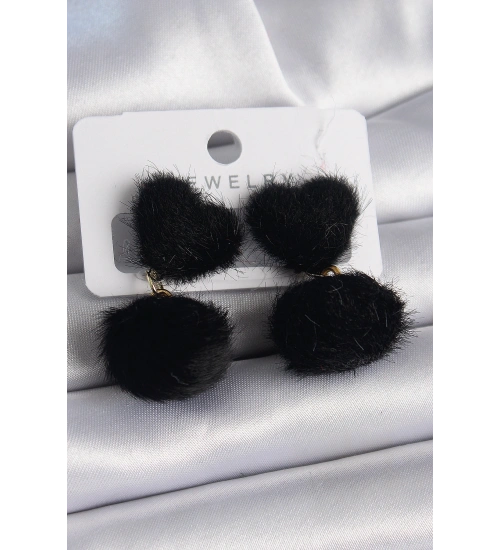 Siyah Tüylü Ponpon Model Kadın Küpe