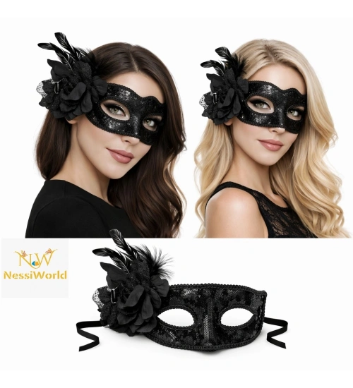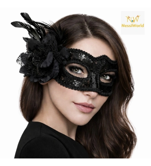 Siyah Venedik Parti Maskesi – Çiçekli Tüylü Payetli