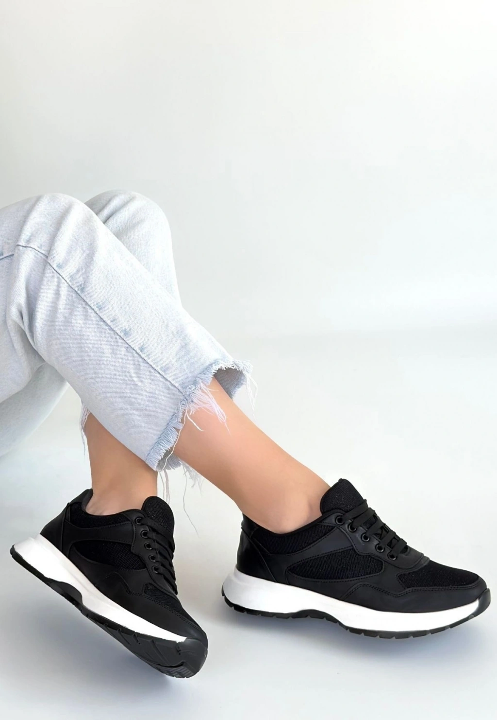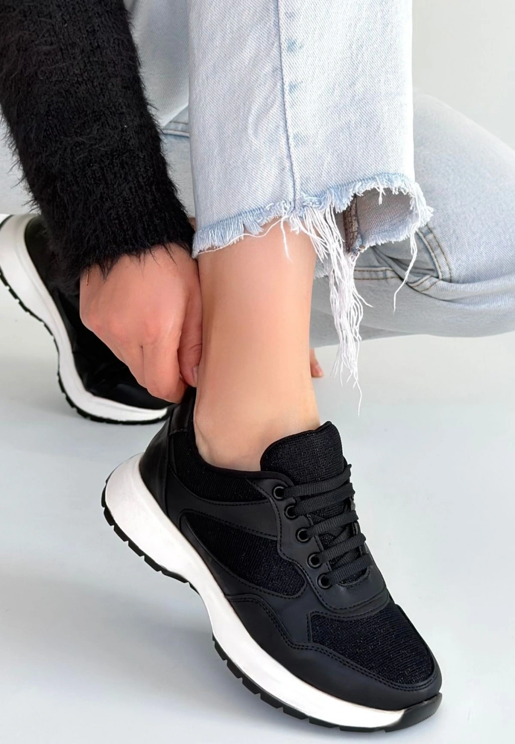 Junda Siyah Cilt Bağcıklı Spor Ayakkabı