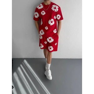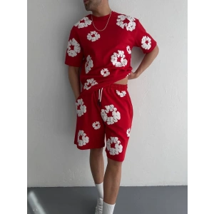 İki İplik Kumaş Baskılı T-shirt Şortlu Takım- Kırmızı