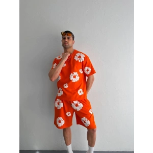İki İplik Kumaş Baskılı T-shirt Şortlu Takım- Turuncu