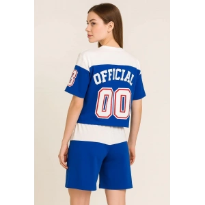 Kadın Şortlu Takım – Oversize İki İplik Kumaş, Ön & Arka Dijital Baskılı Tişört ve Lastikli Cepli Şort, Yazlık Günlük Spor Set - Mavi