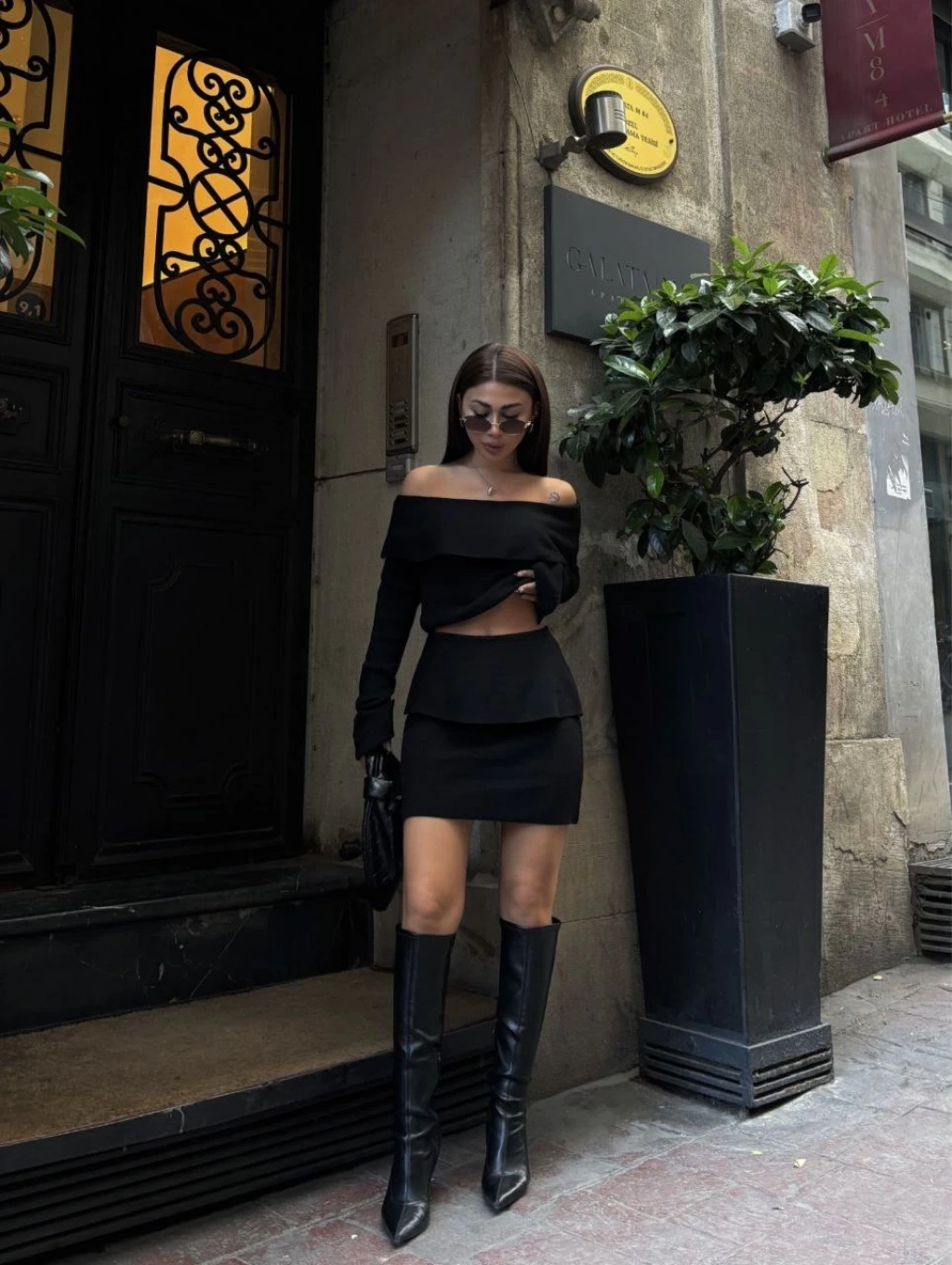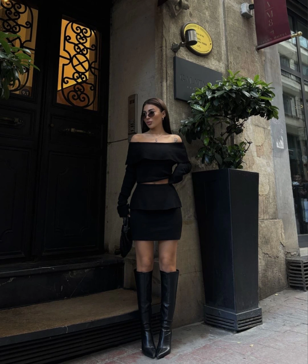 V Yaka 3 Düğmeli Hırka Takım Triko İkili Etekli - Siyah
